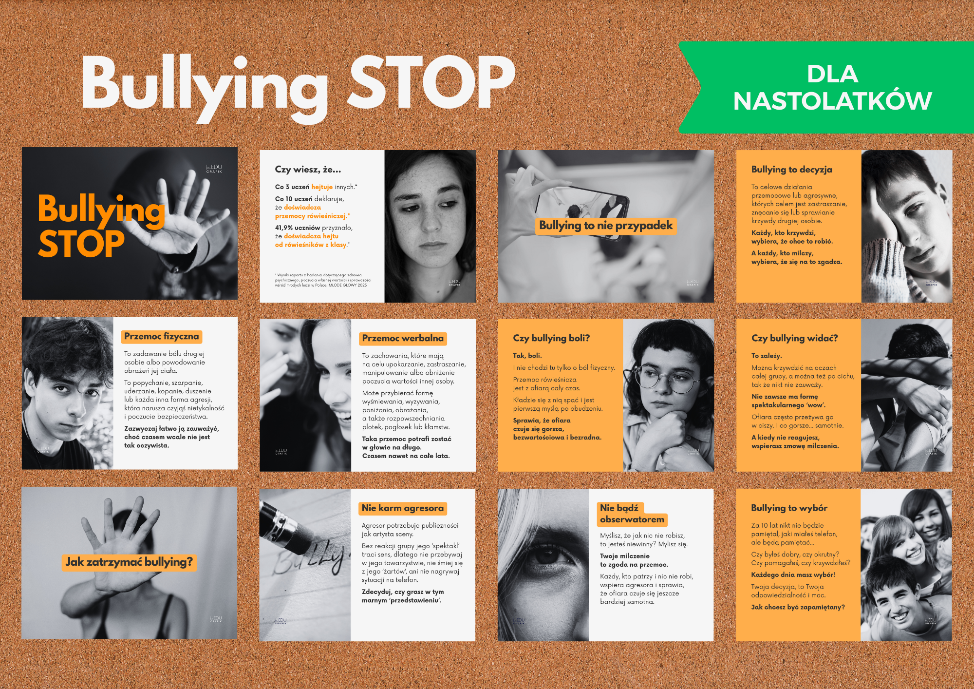 Nowoczesna, czytelna grafika i proste komunikaty sprawiają, że materiał trafia bezpośrednio do młodych ludzi. To praktyczne narzędzie wspiera profilaktykę przemocy, wzmacnia świadomość i ułatwia rozpoczęcie rozmów o trudnych tematach.