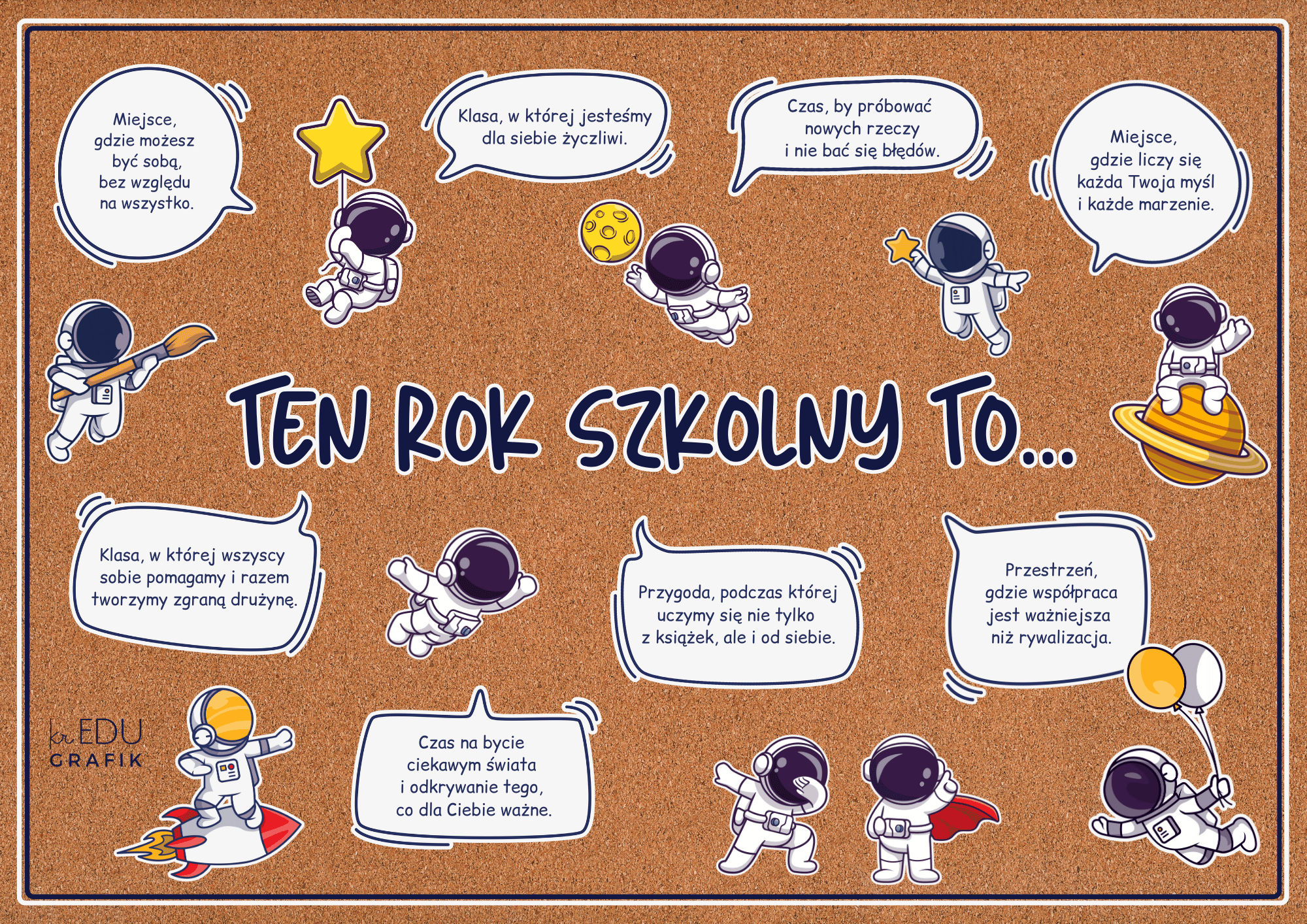 Ten rok szkolny to wyjątkowa podróż! Gazetka w klimacie kosmicznej misji pokazuje uczniom, że szkoła to miejsce współpracy, życzliwości i odkrywania siebie. Zainspirowana prawdziwą misją polskiego astronauty, pokazuje dzieciom, że każdy może wyruszyć w swoją własną podróż po wiedzę, odwagę i marzenia.