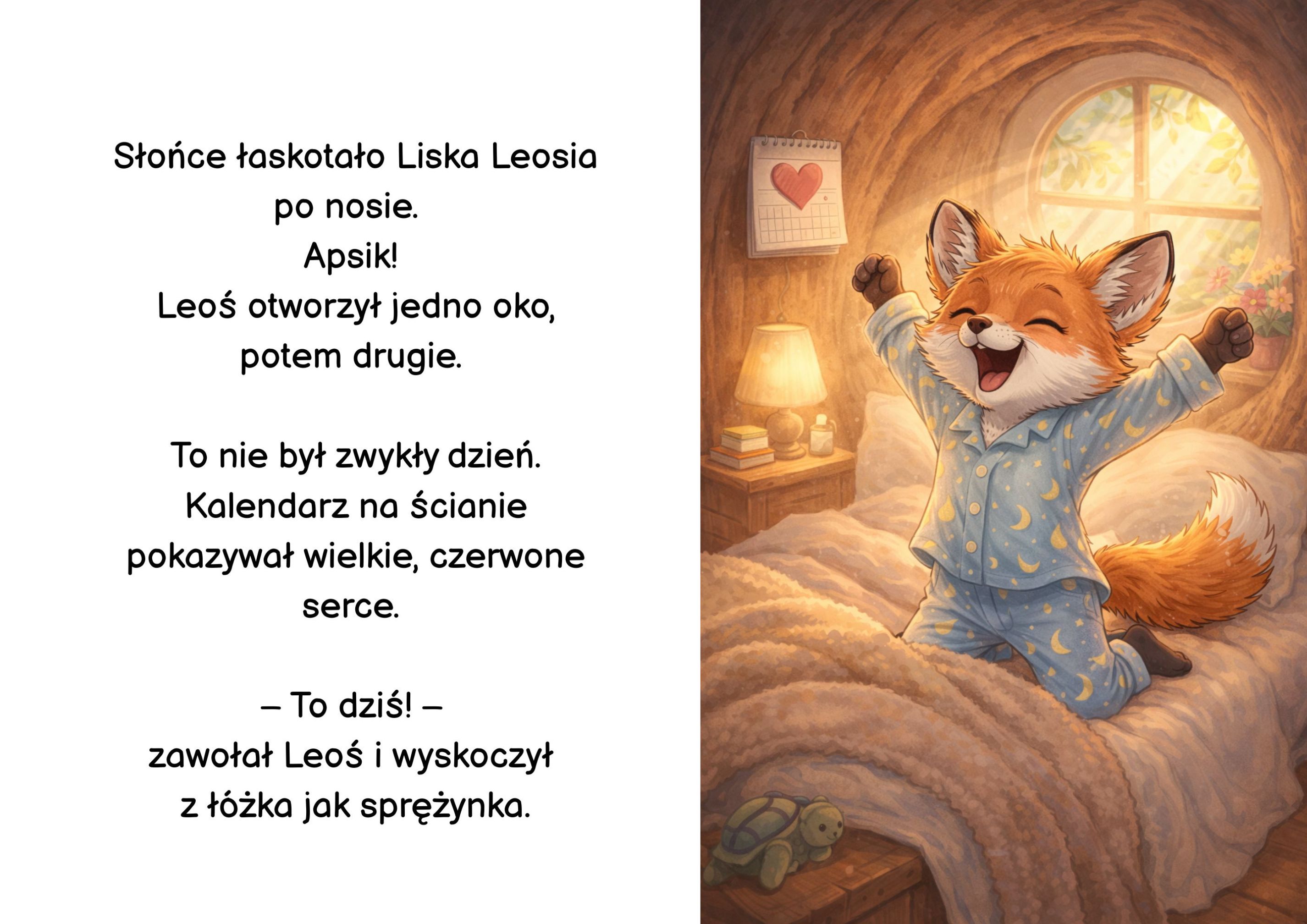 Jest poranek Walentynek. Mały Lisek Leoś zakłada pelerynę ze starego kocyka i gogle pływackie. Nie szuka jednak romantycznych przygód. Wyrusza na trzy "tajne misje", aby sprawdzić, czy jego "Serce-Radar" wykryje kogoś w potrzebie.