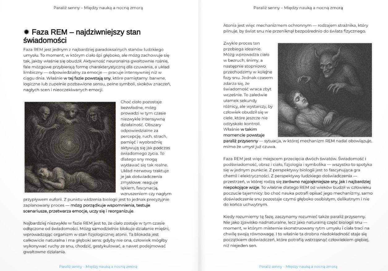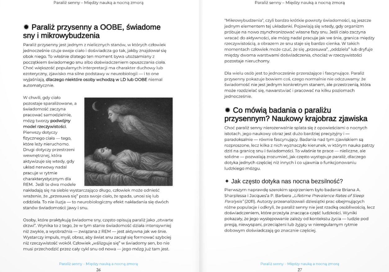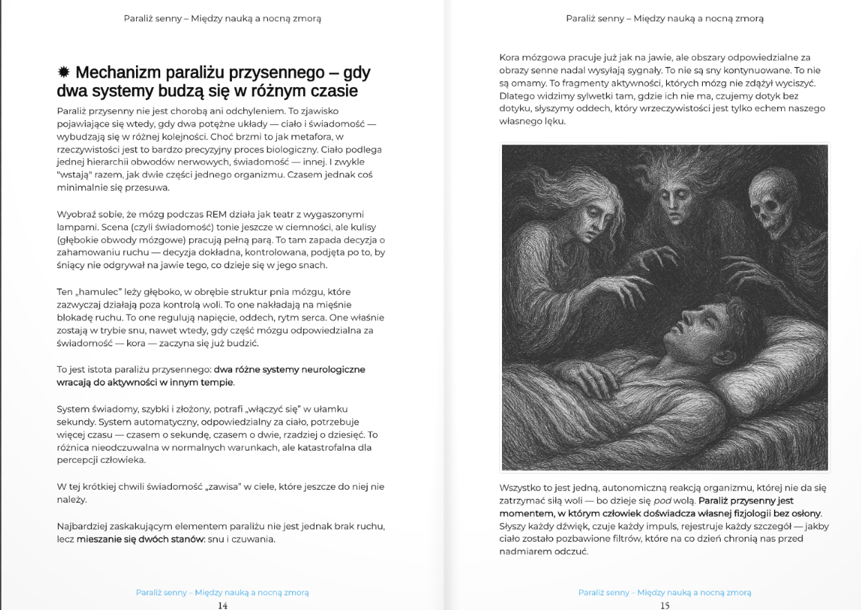 „Paraliż senny – Między nauką a nocną zmorą” to kompleksowy, rzetelny i wyjątkowo przystępny przewodnik po jednym z najbardziej niezwykłych stanów, jakich może doświadczyć człowiek. Paraliż senny – moment, w którym świadomość budzi się szybciej niż ciało – potrafi być zarówno fascynujący, jak i głęboko przerażający. W tym e-booku znajdziesz pełne wyjaśnienie tego zjawiska, oparte wyłącznie na potwierdzonych badaniach.