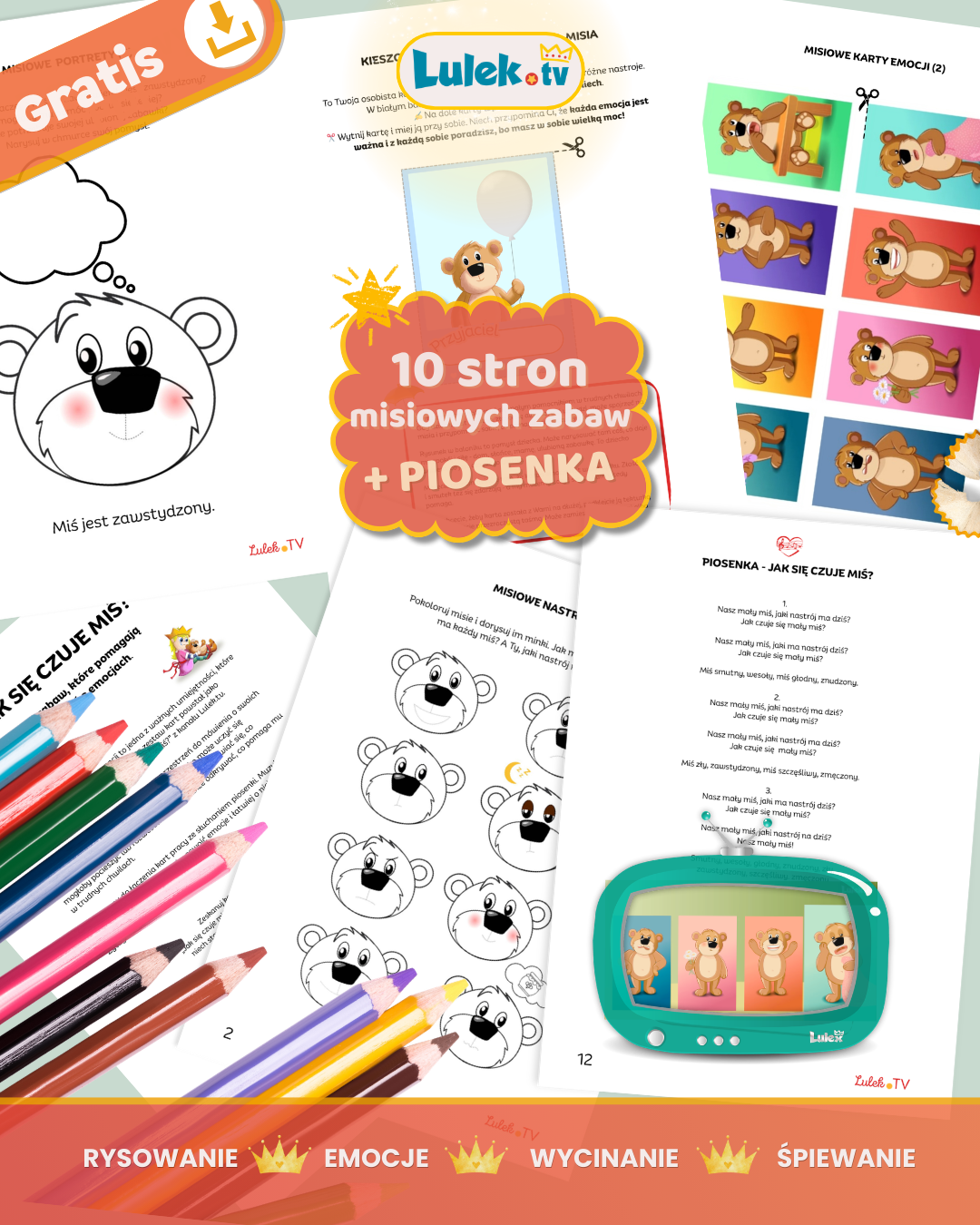 Ten darmowy zestaw kart pracy o emocjach dla dzieci pomaga w prosty i naturalny sposób rozmawiać z dzieckiem o uczuciach poprzez zabawę, rysowanie i muzykę. Materiał powstał jako rozszerzenie piosenki „Jak się czuje miś?” z kanału Lulek.tv i zawiera 10 stron zabaw do druku, które wspierają rozwój emocjonalny dziecka. W środku znajduje się także tekst piosenki oraz kieszonkowa karta misia, która pomaga dziecku przypomnieć sobie, co może zrobić w trudnych chwilach.