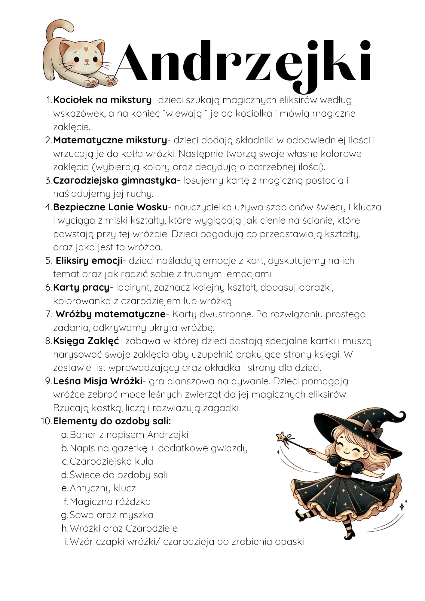 Wprowadź magię i zabawę na Andrzejki dzięki naszemu specjalnemu zestawowi do druku! Idealny dla przedszkolaków i małych dzieci, zawiera 10 magicznych aktywności, które sprawią, że maluchy będą oczarowane przez cały dzień. Od tworzenia mikstur i magicznej gimnastyki po bezpieczne lanie wosku i zabawy z emocjami – każdy znajdzie coś dla siebie!