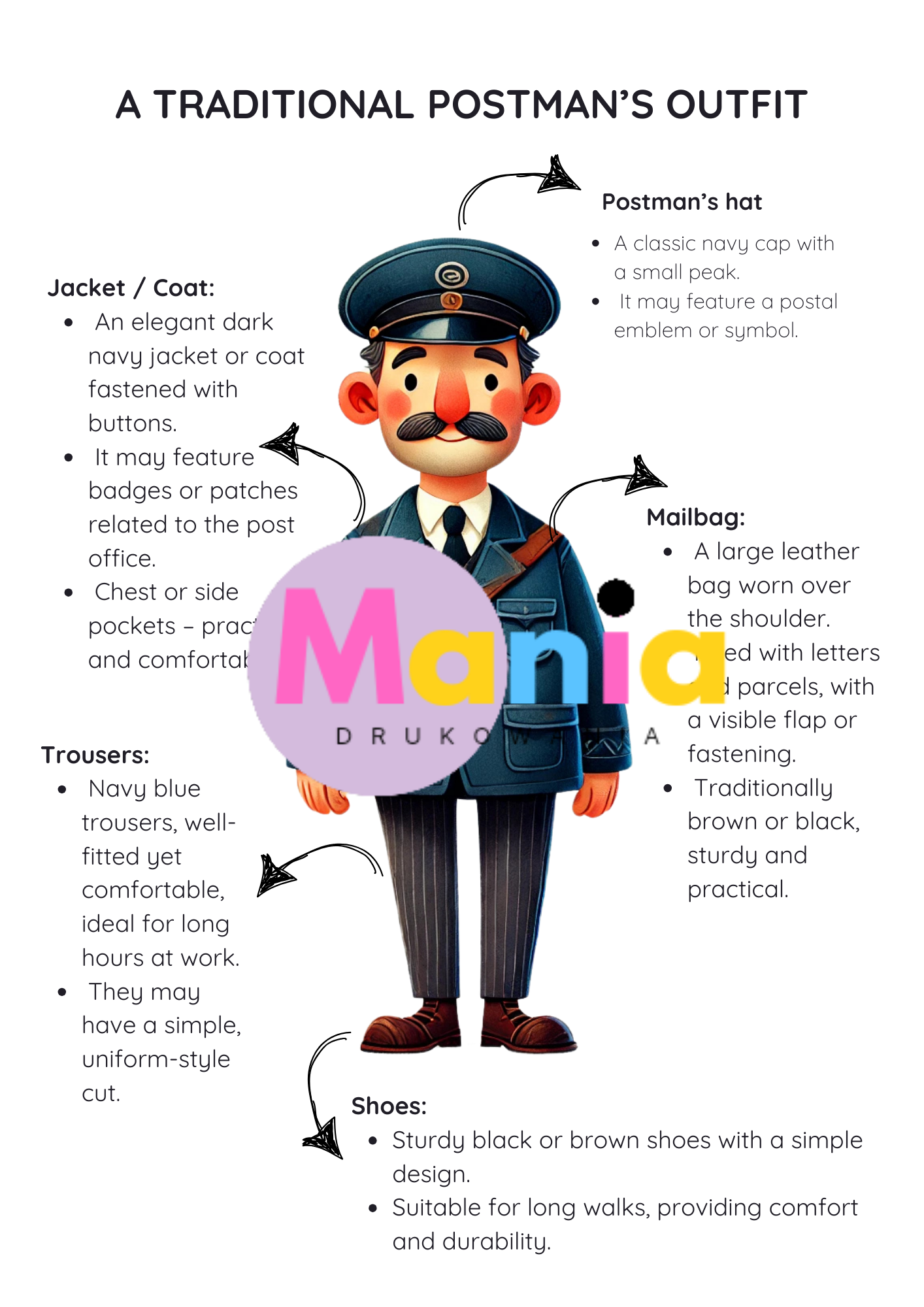 • ilustracje skrzynki pocztowej i listonosza wraz z opisami,
