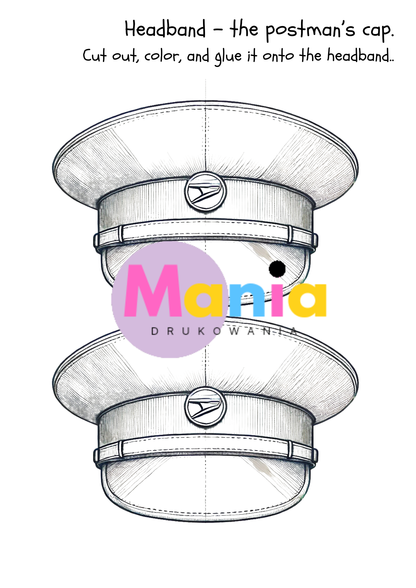 • szablon czapki listonosza do wycięcia, pokolorowania i przyklejenia do opaski.