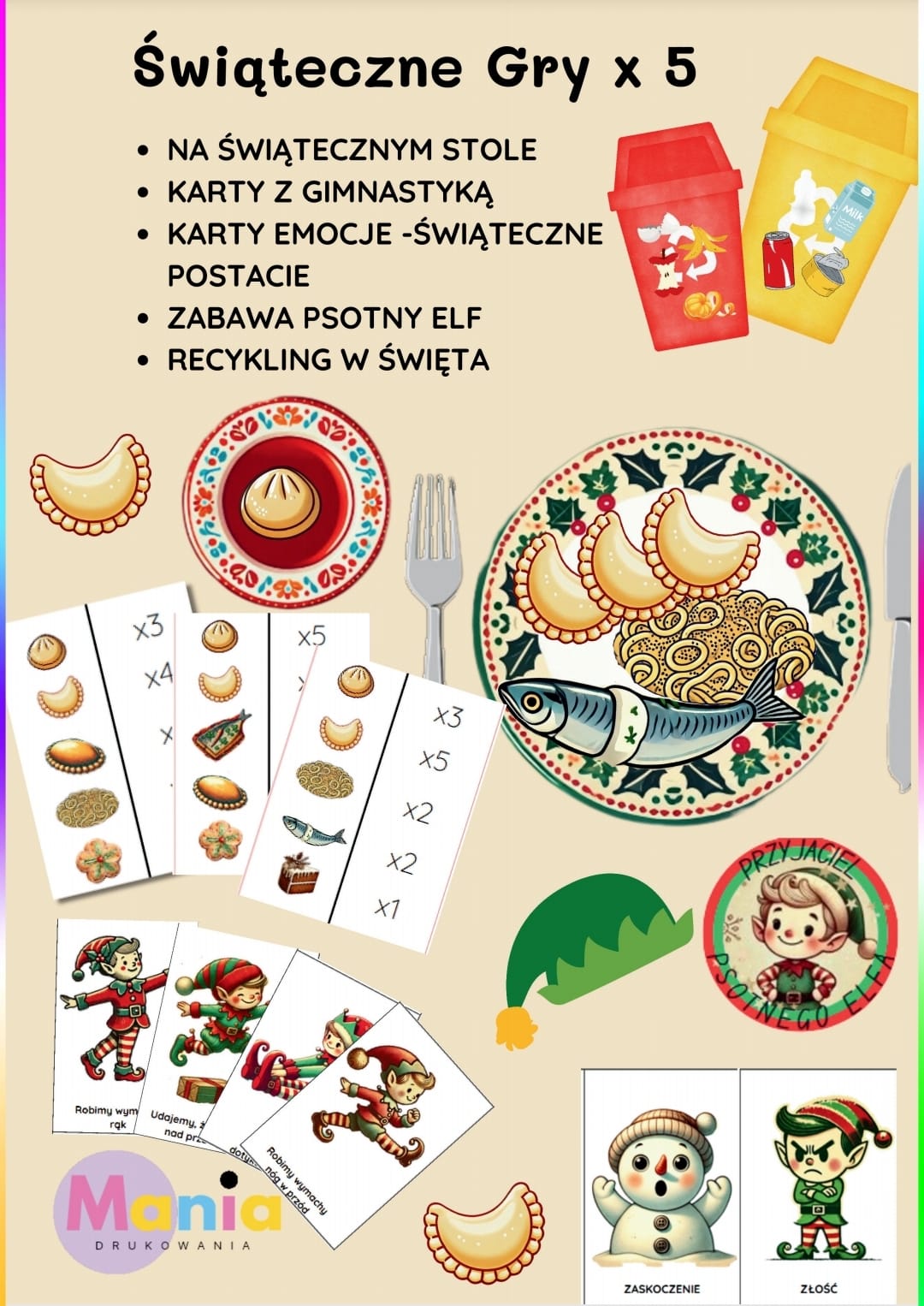 ●Recykling w święta- dzieci uczą się segregacji śmieci do 4 pojemników, mają zestaw żetonów i muszą dopasować do którego pojemnika należy je włożyć.