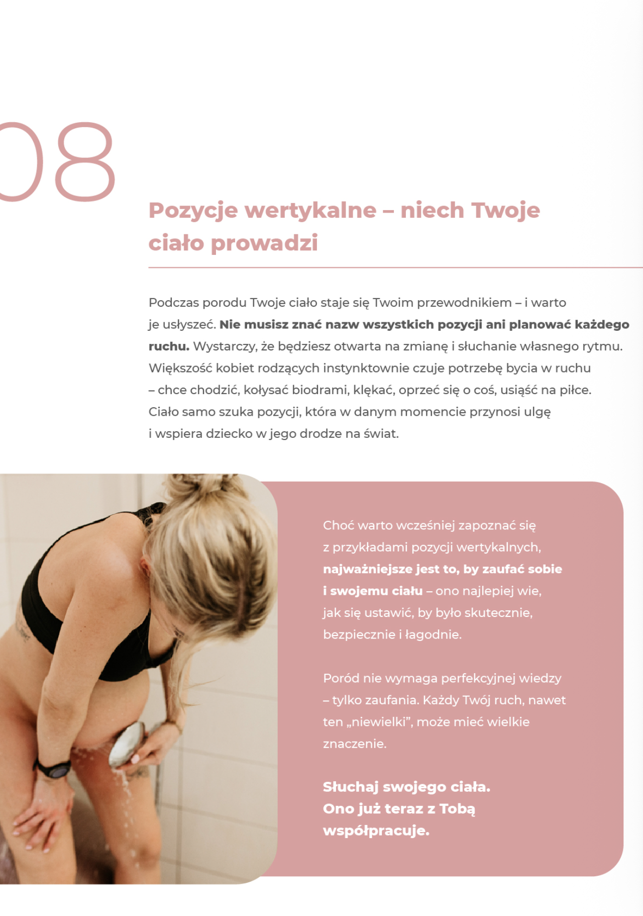 Ten rozdział pokazuje, jak bardzo ciało „wie”, co robi. Pozycje, które wspierają poród, zmniejszają napięcie i pomagają dziecku. Konkretne wskazówki, które możesz wykorzystać od razu.