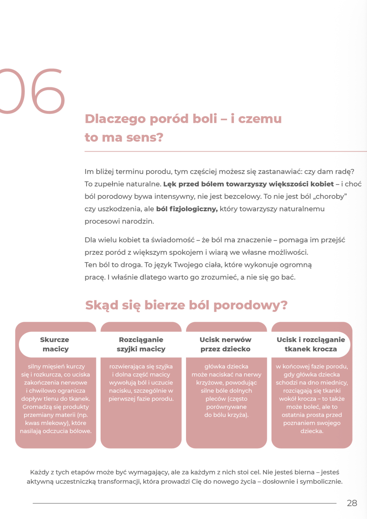 Zamiast straszenia — zrozumienie. Ten rozdział pomaga oswoić ból porodowy i spojrzeć na niego bez lęku. Kiedy wiesz, co się dzieje w ciele, łatwiej jest przejść przez skurcze z większym spokojem.