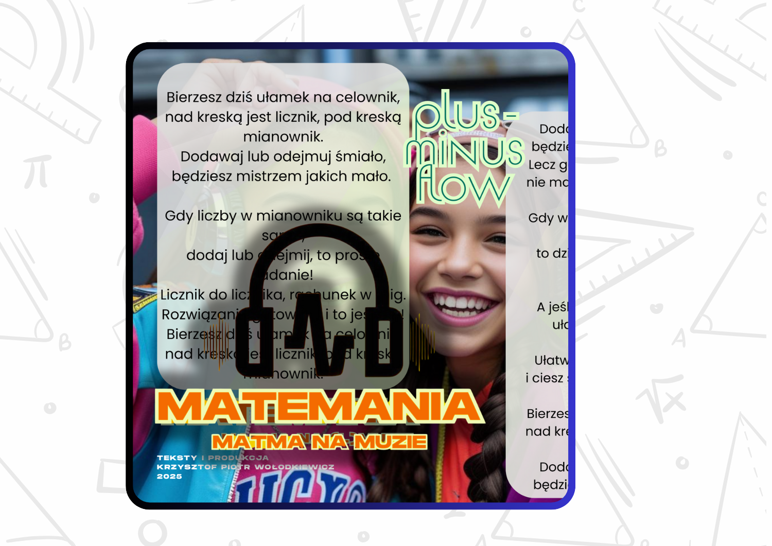 🎶1🎧 Genialny mat-klip z ➕➖ "Plus-minus flow" – wideo z animacjami wprowadza uczniów w świat dodawania i odejmowania ułamków zwykłych, wpadającą w ucho muzyką, wesołym i rozwijającym, autorskim tekstem, który pomoże dziecku zrozumieć, zapamiętać i utrwalić zasadę dodawania i odejmowania ułamków zwykłych,