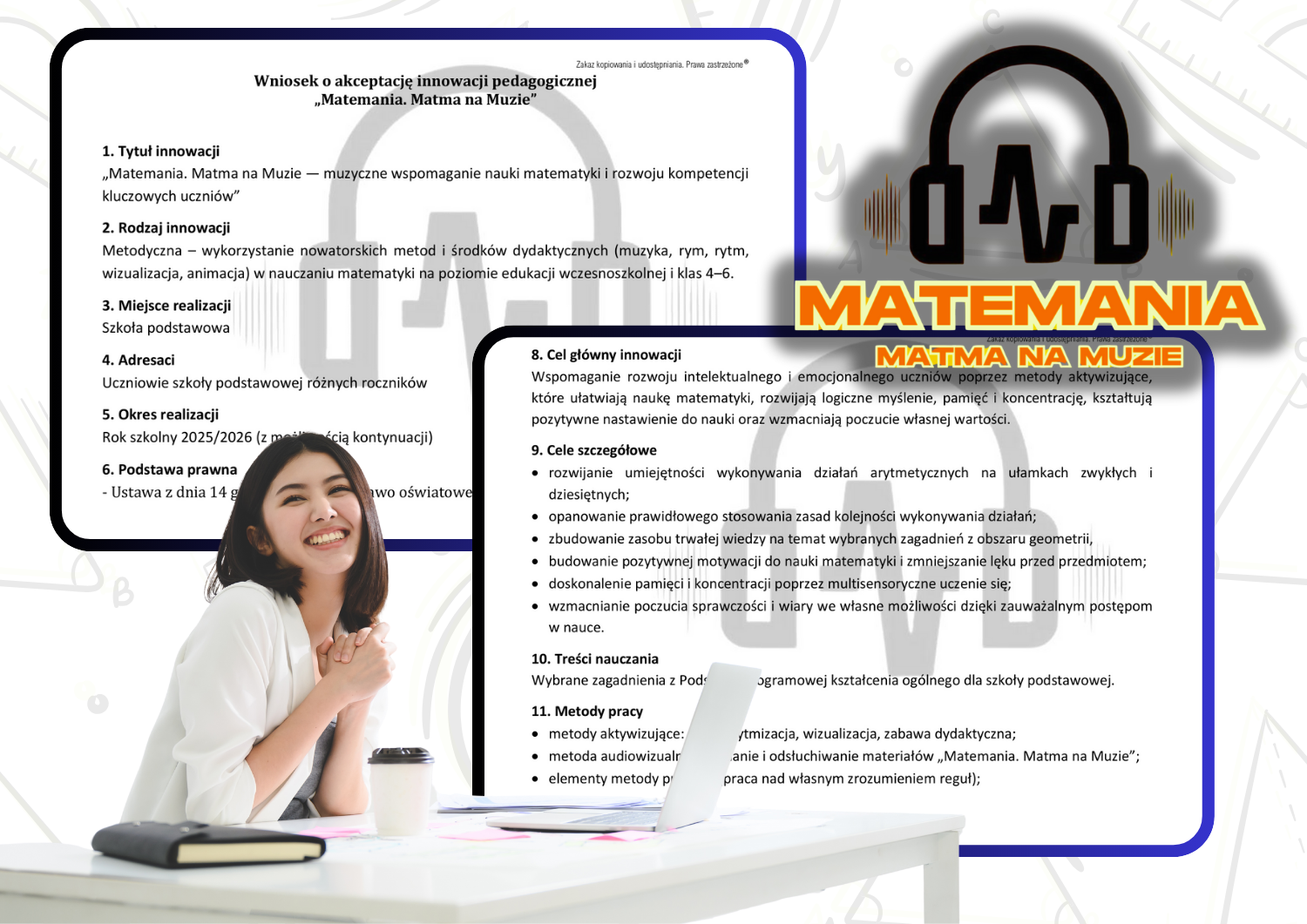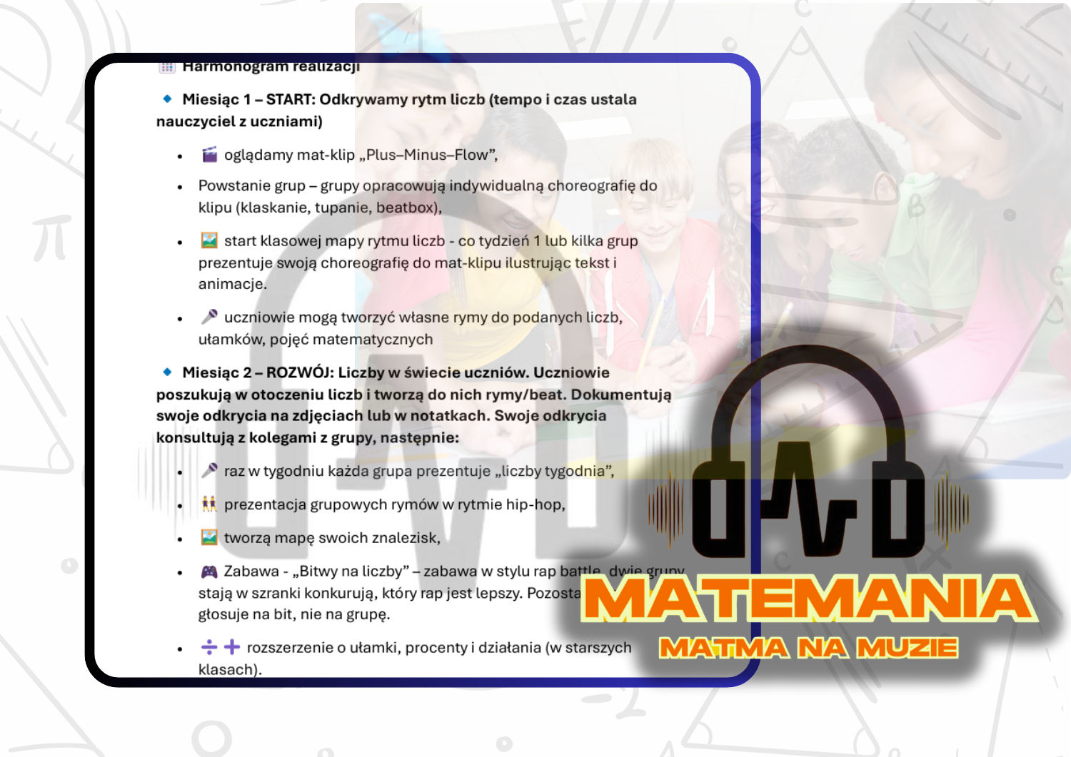 🎶Projekt edukacyjny "Rytm Liczb", który można realizować w różnych okresach czasu (tydzień/miesiąc/semestr/rok/ nauczyciel może go modyfikować w zależności od planu swojej pracy czy realizowanego programu), z celami, metodami, przebiegiem, wskazówkami i ewaluacją. Innowacyjny i angażujący uczniów do różnorodnych aktywności i odpowiadający ich potrzebom. Wszystkie ćwiczenia i zadania odwołują się do otaczającego ucznia świata materialno-społecznego, a matemagiczne narzędzia, mają indywidualny charakter.