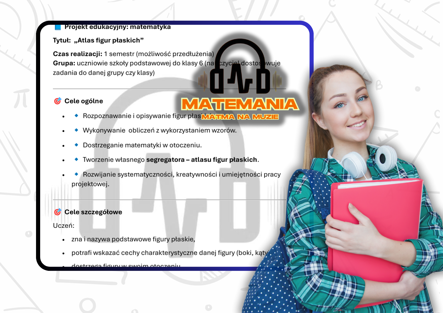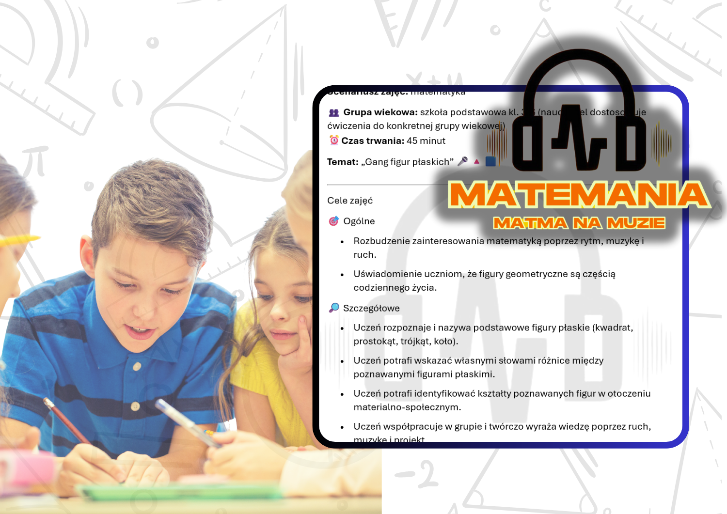 🎶 Projekt edukacyjny "Atlas figur płaskich", angażujący uczniów, o charakterze długofalowym (tydzień/miesiąc/semestr/rok/ nauczyciel może go modyfikować w zależności od planu swojej pracy czy realizowanego programu), innowacyjny i angażujący uczniów do różnorodnych aktywności i odpowiadający ich potrzebom. Wszystkie ćwiczenia i zadania odwołują się do otaczającego ucznia świata materialno-społecznego, a matemagiczne narzędzia, mają indywidualny charakter.