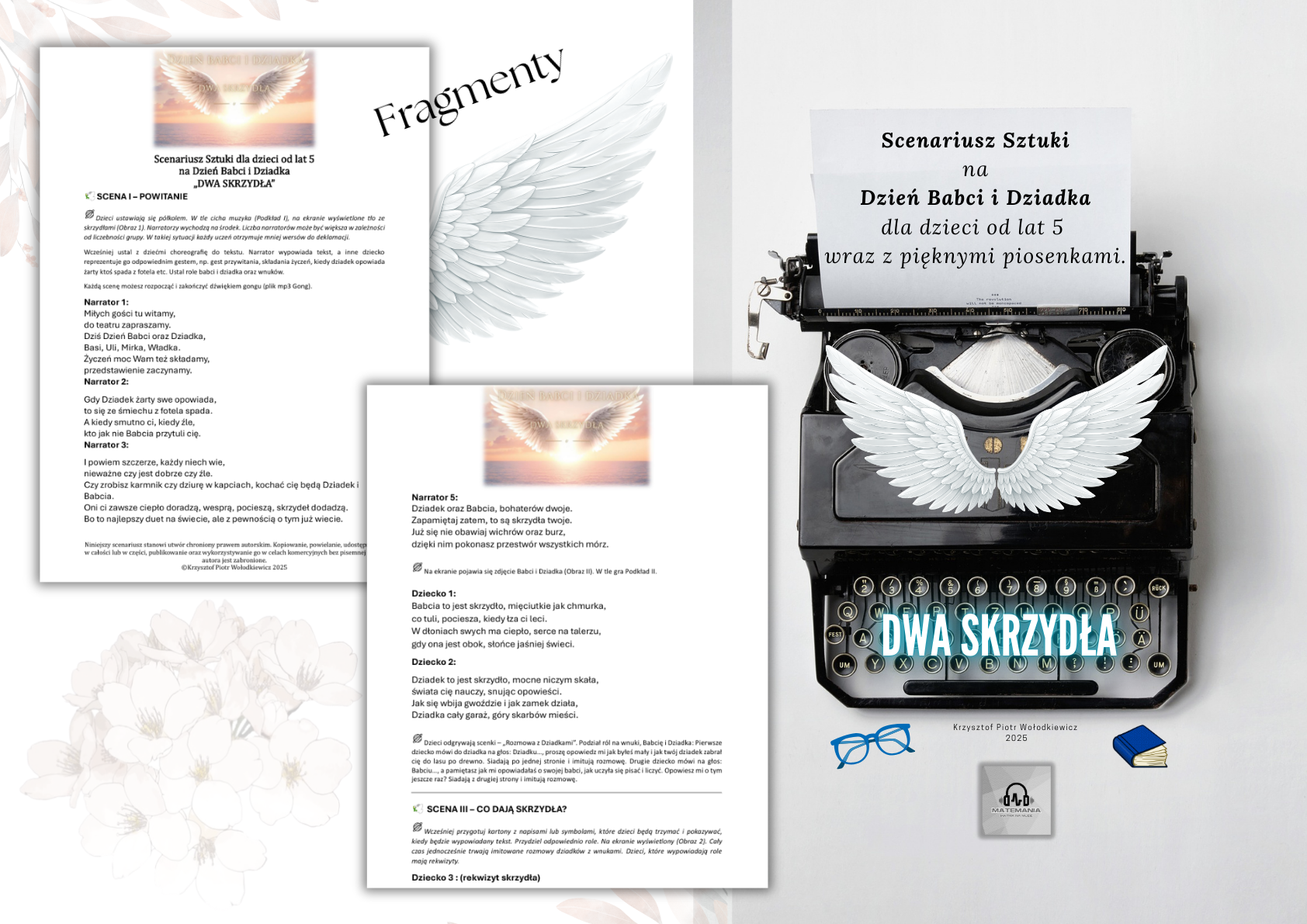 >piękną grafiką, >autorskimi tekstami, >rymowanymi kwestiami narratorów, >pięknymi, wzruszającymi piosenkami, >muzycznymi podkładami piosenek, >tutorialem wykonania skrzydeł w formacie pdf, a także pomysłami na choreografię i rekwizyty. Każda scena została zaprojektowana tak, by była prosta do realizacji, a jednocześnie efektowna i poruszająca.