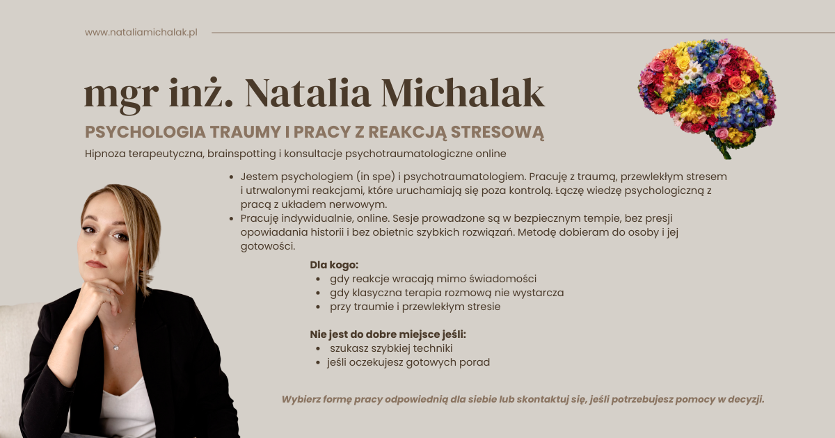 Pracuję z traumą, przewlekłym stresem oraz utrwalonymi reakcjami, które uruchamiają się automatycznie - mimo świadomości i wcześniejszej pracy nad sobą.