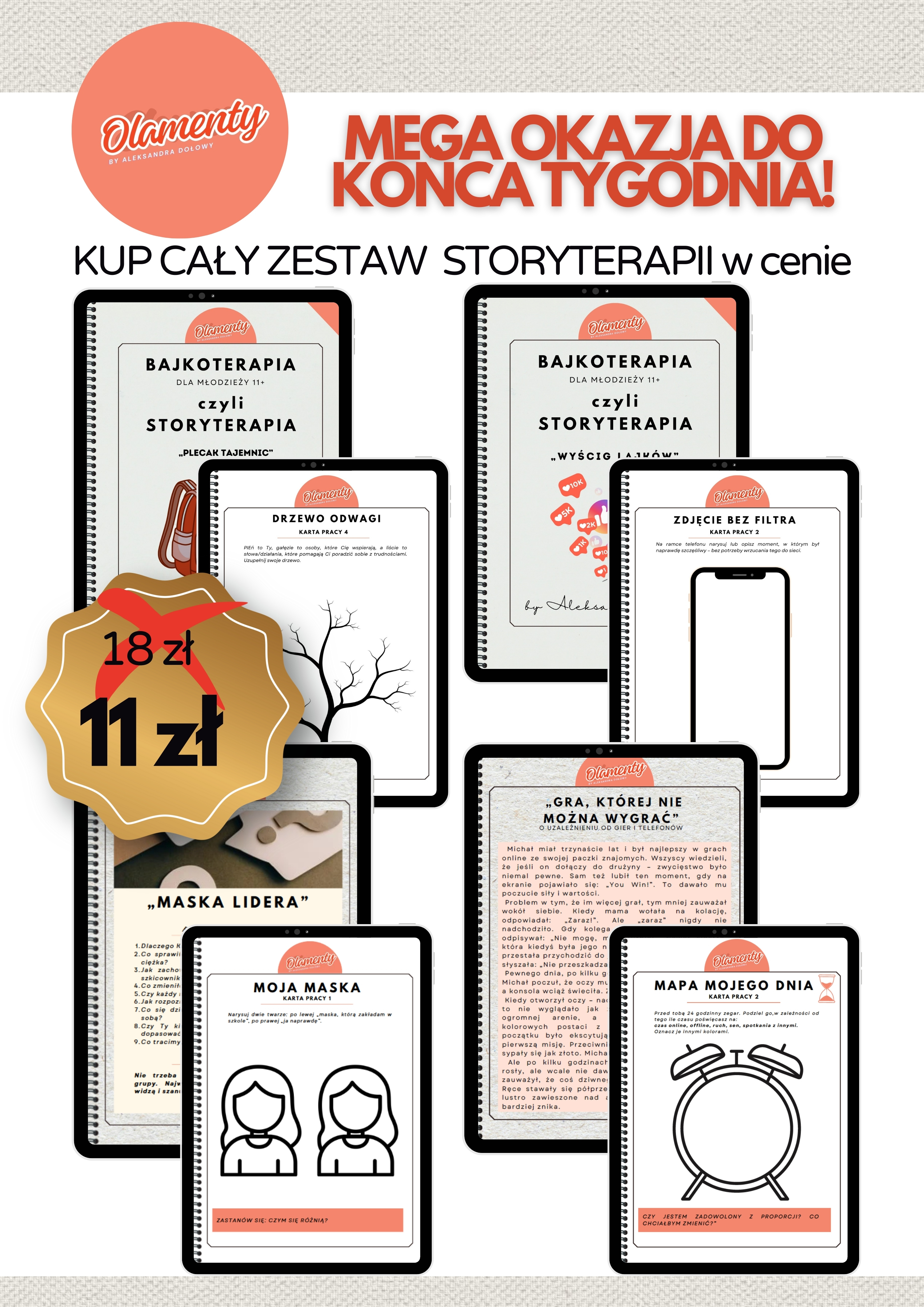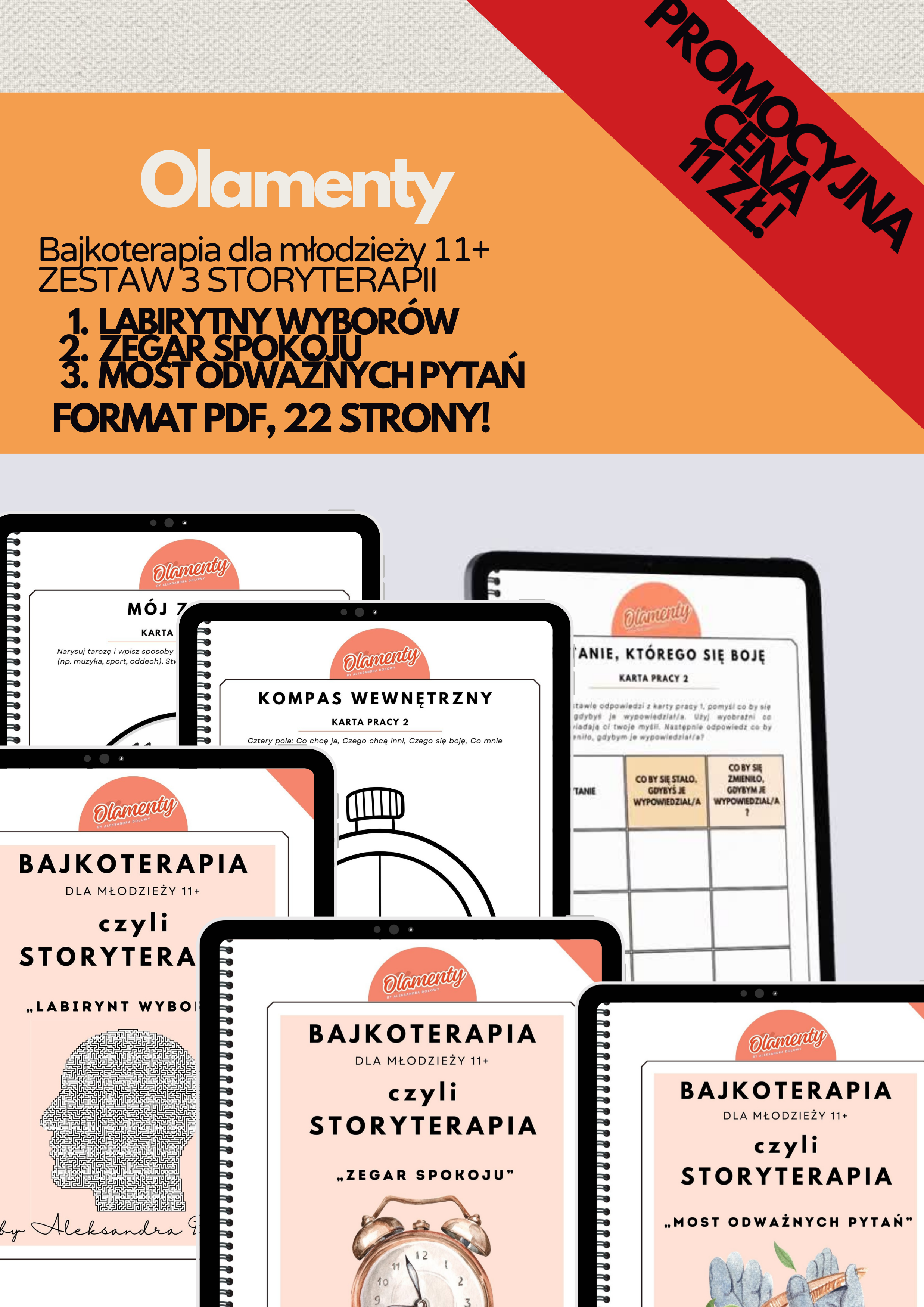 PromocjaZestaw 3 opowieści - STORYTERAPIA 11+Zestaw 3 bajek terapeutycznych z kartami pracy. Emocje, stres i odwaga w pracy z młodzieżą.15,00 zł11,00 zł