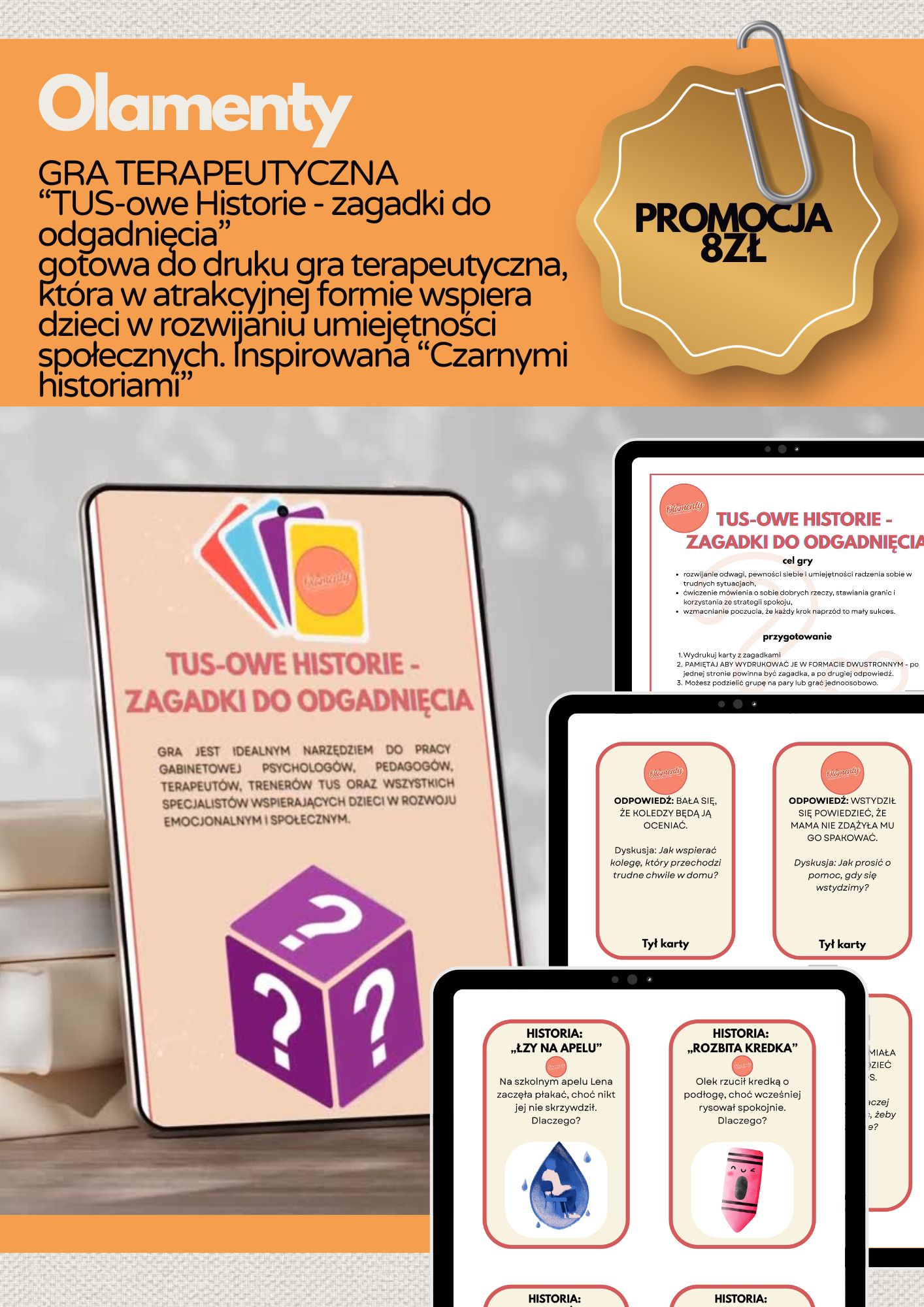 PromocjaTUS-owe historie – Zagadki do odgadnięciaGra terapeutyczna z kartami zagadek. Emocje, relacje i TUS w formie zabawy.10,00 zł8,00 zł -