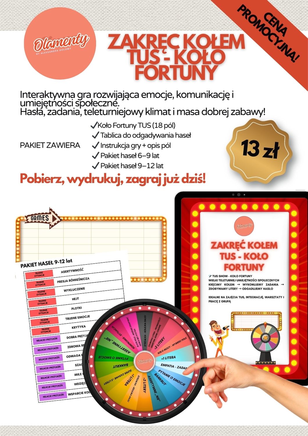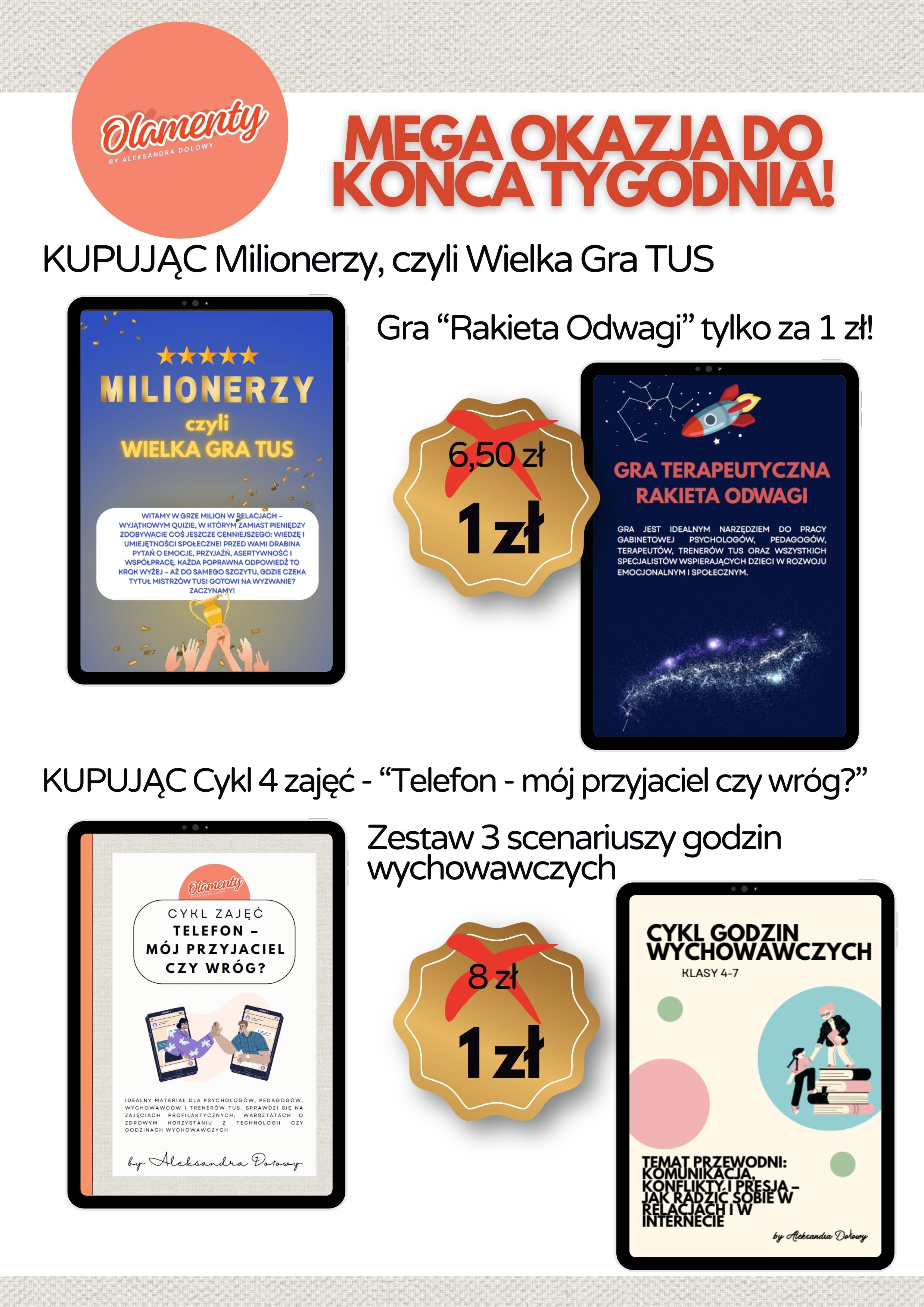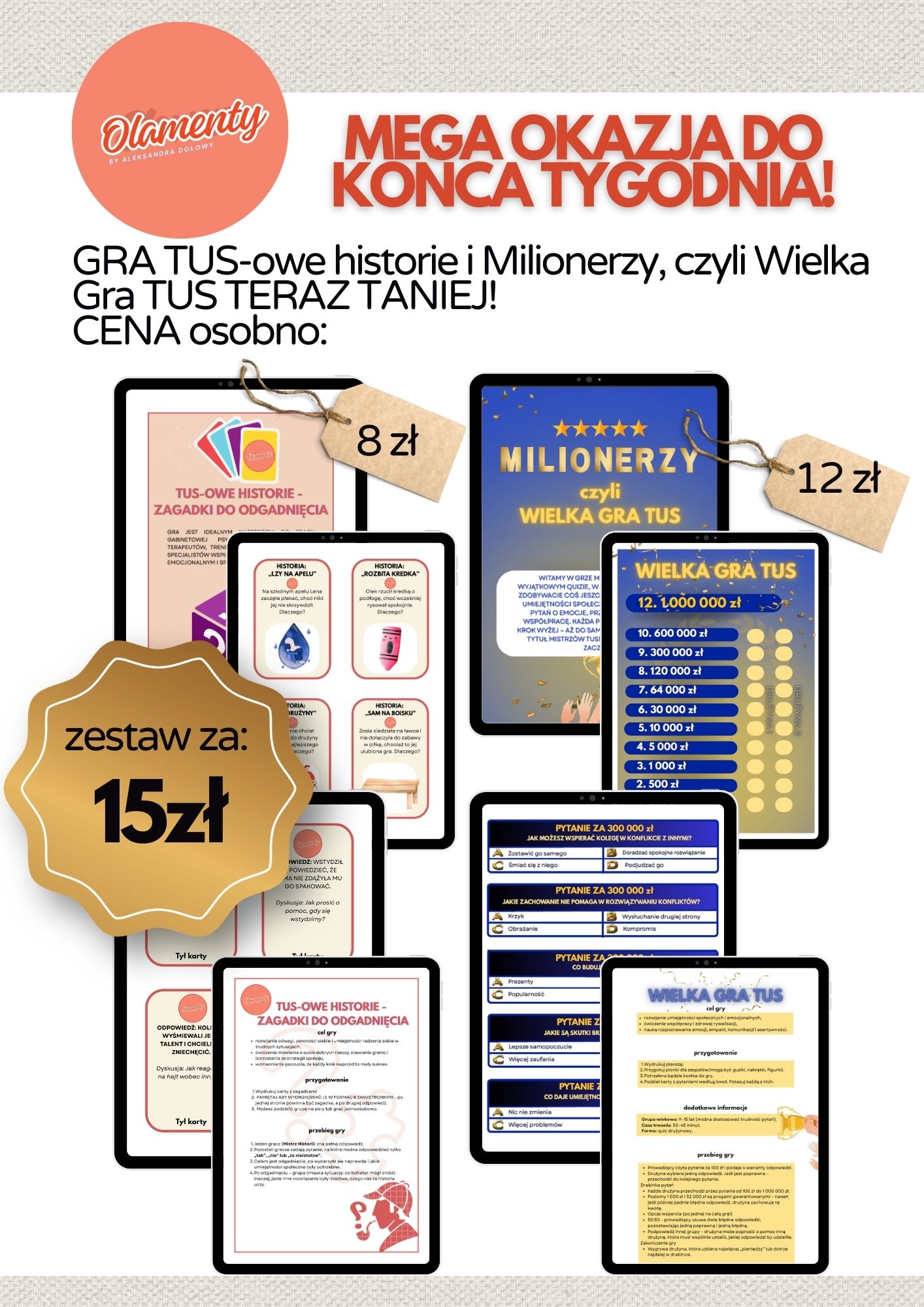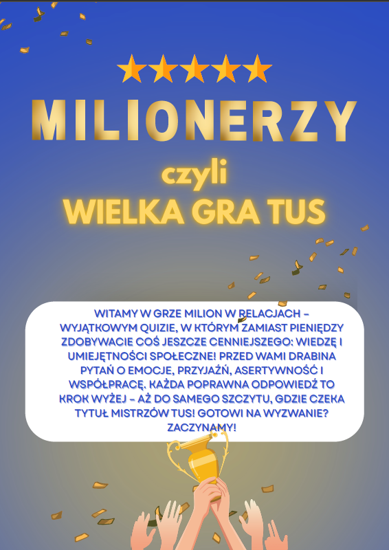 Milionerzy, czyli Wielka Gra TUS„Milionerzy TUS” – 96 kart pytań o emocje, relacje i asertywność. Gra PDF dla dzieci 9–15 lat.12,00 zł -