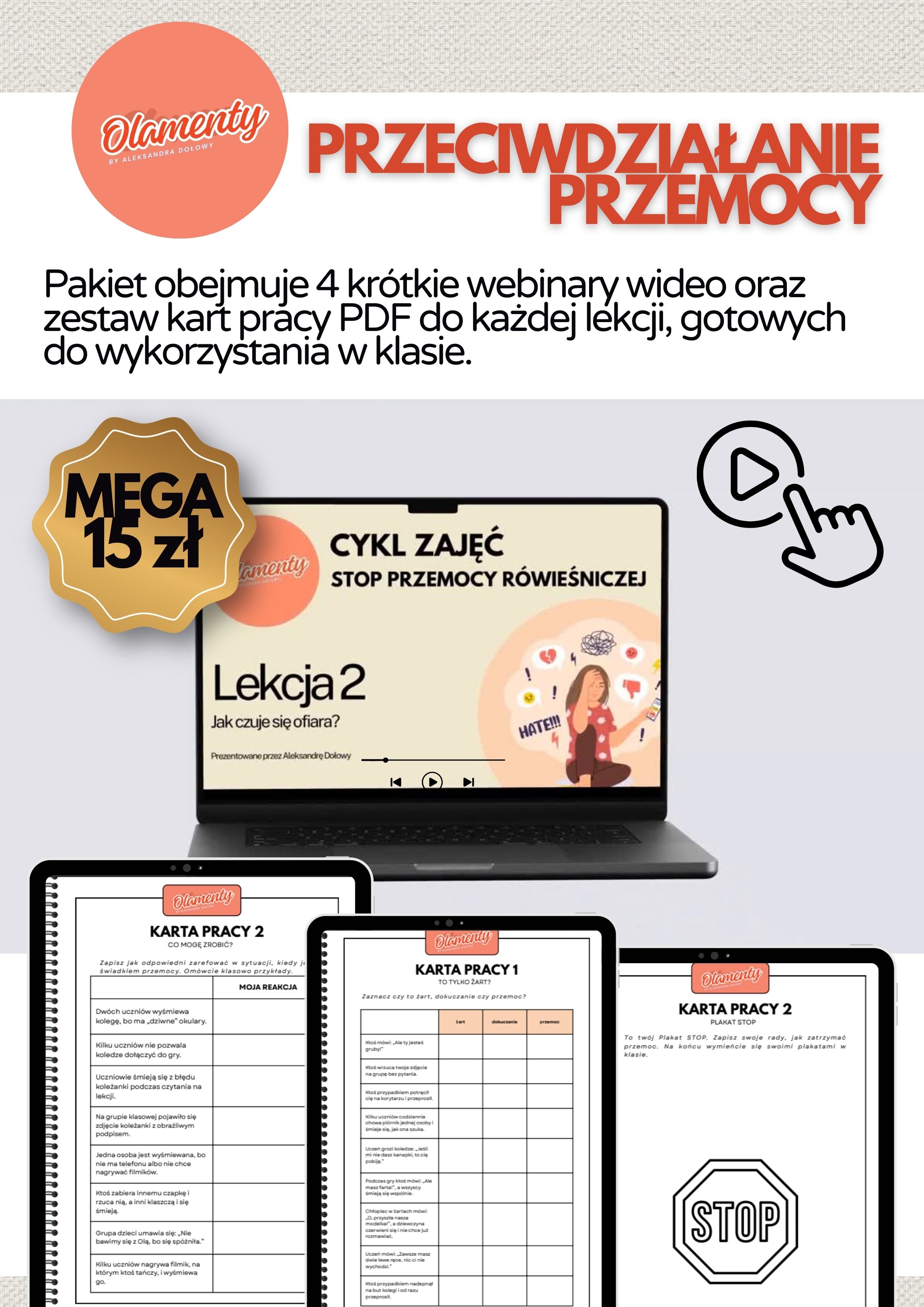 Pakiet Przeciwdziałanie Przemocy Rówieśniczej - webinary i karty pracyTydzień przeciw przemocy – 4 webinary + karty pracy. Empatia, reakcja, wsparcie w klasie.15,00 zł -