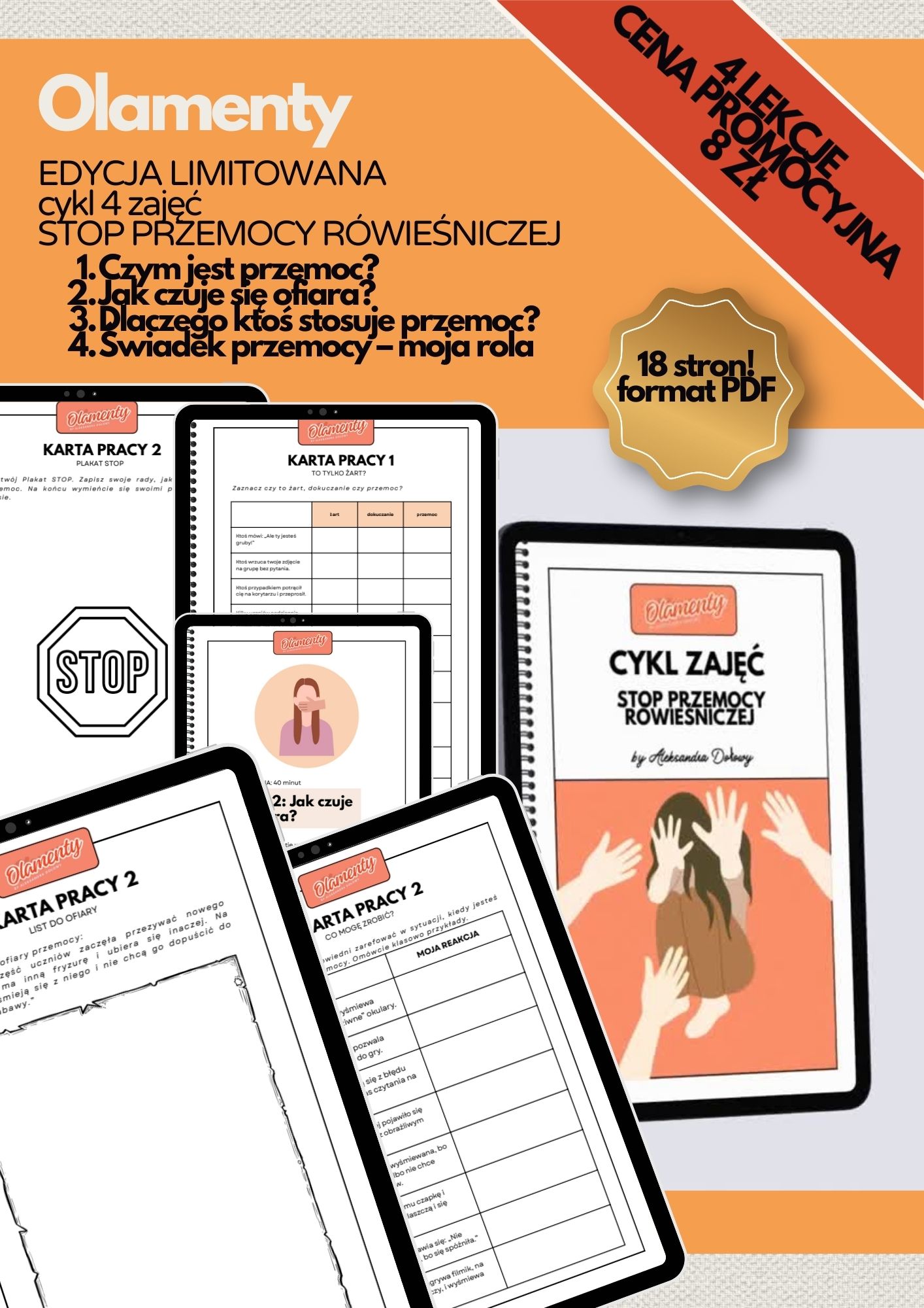 PromocjaCykl zajęć "STOP PRZEMOCY RÓWIEŚNICZEJ"„Cykl 4 lekcji o przemocy rówieśniczej z kartami pracy. PDF 18 stron, cena promocyjna 8 zł.”10,00 zł8,00 zł -