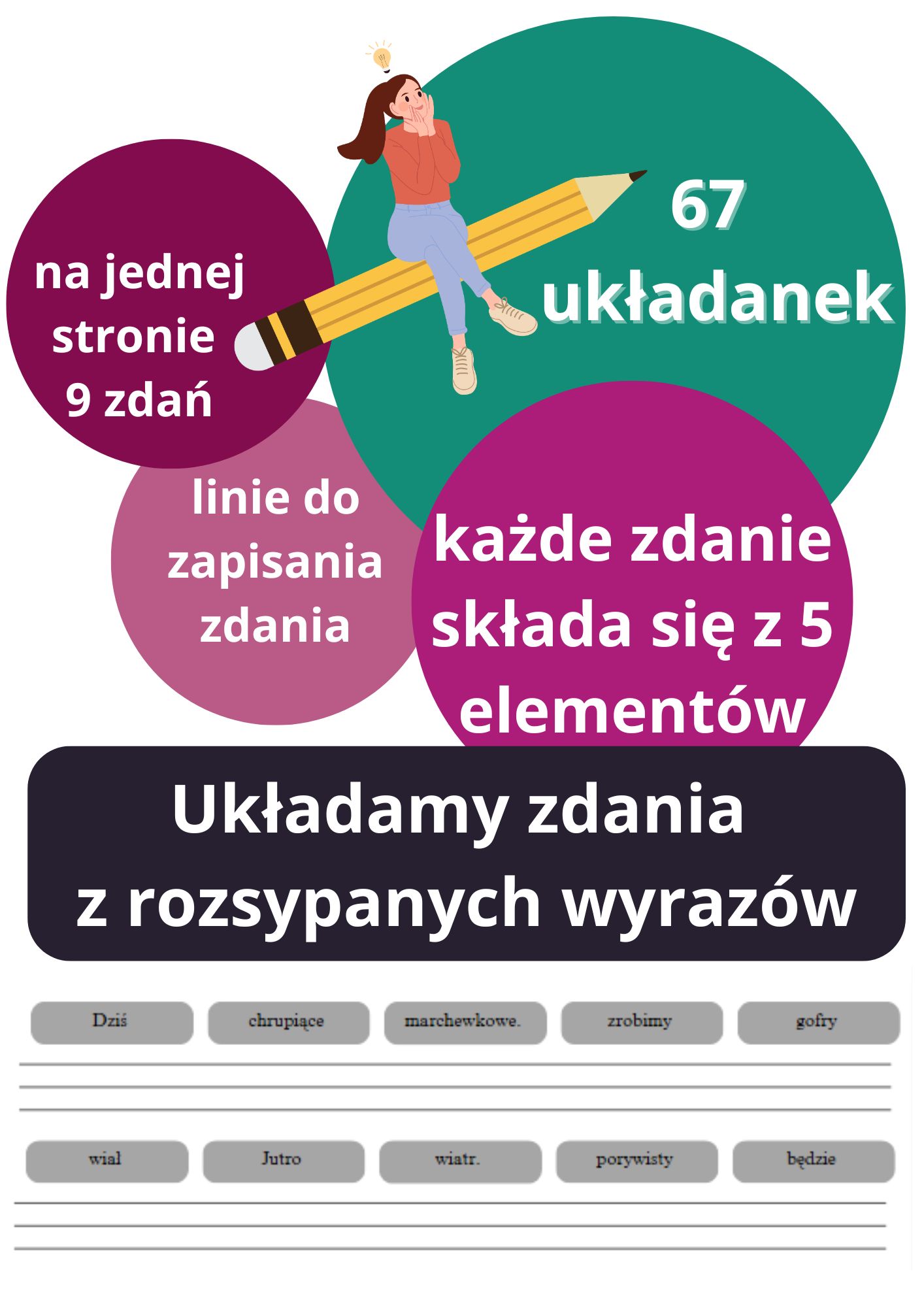 Pakiet zawiera 67 zdań składających się z 5 elementów. Na każdej stronie znajdziesz 9 kopii zdania, wystarczy, że skserujesz odpowiednią ilość razy i potniesz na paski - masz gotową wklejkę.