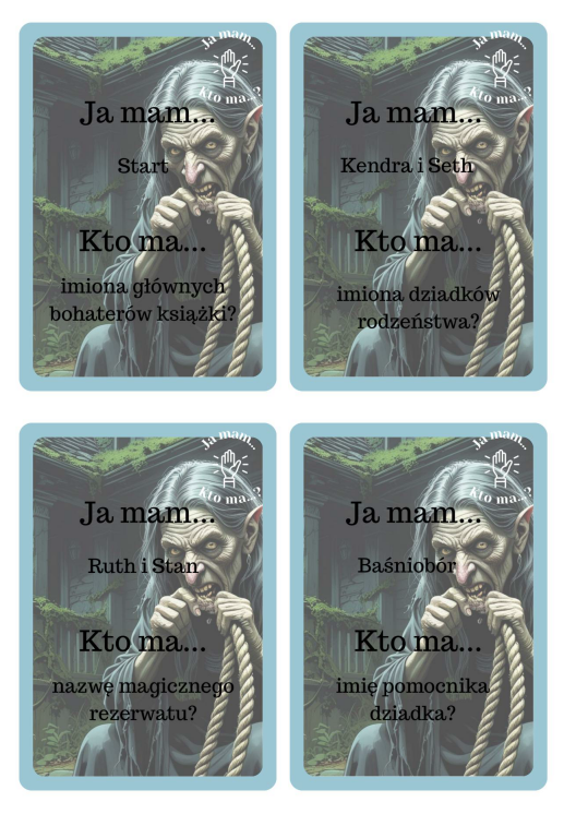 1. karta - obrazki nawiązujące do powieści, zadaniem uczniów jest wyjaśnić powiązanie obrazka z treścią lektury