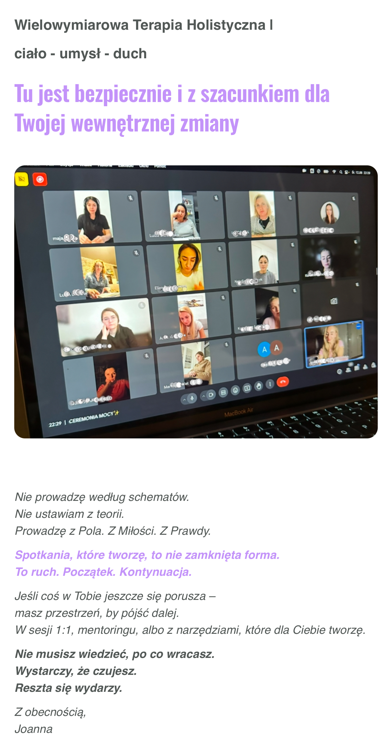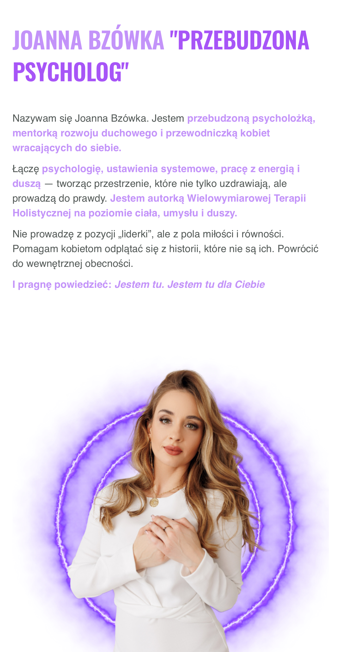 Tworzę głębokie przestrzenie przemiany, które dopasowują się do tego, kim jesteś — nie kim masz być. Jestem.Nie tą od szybkich recept. Nie tą, która Ci powie, co masz robić.