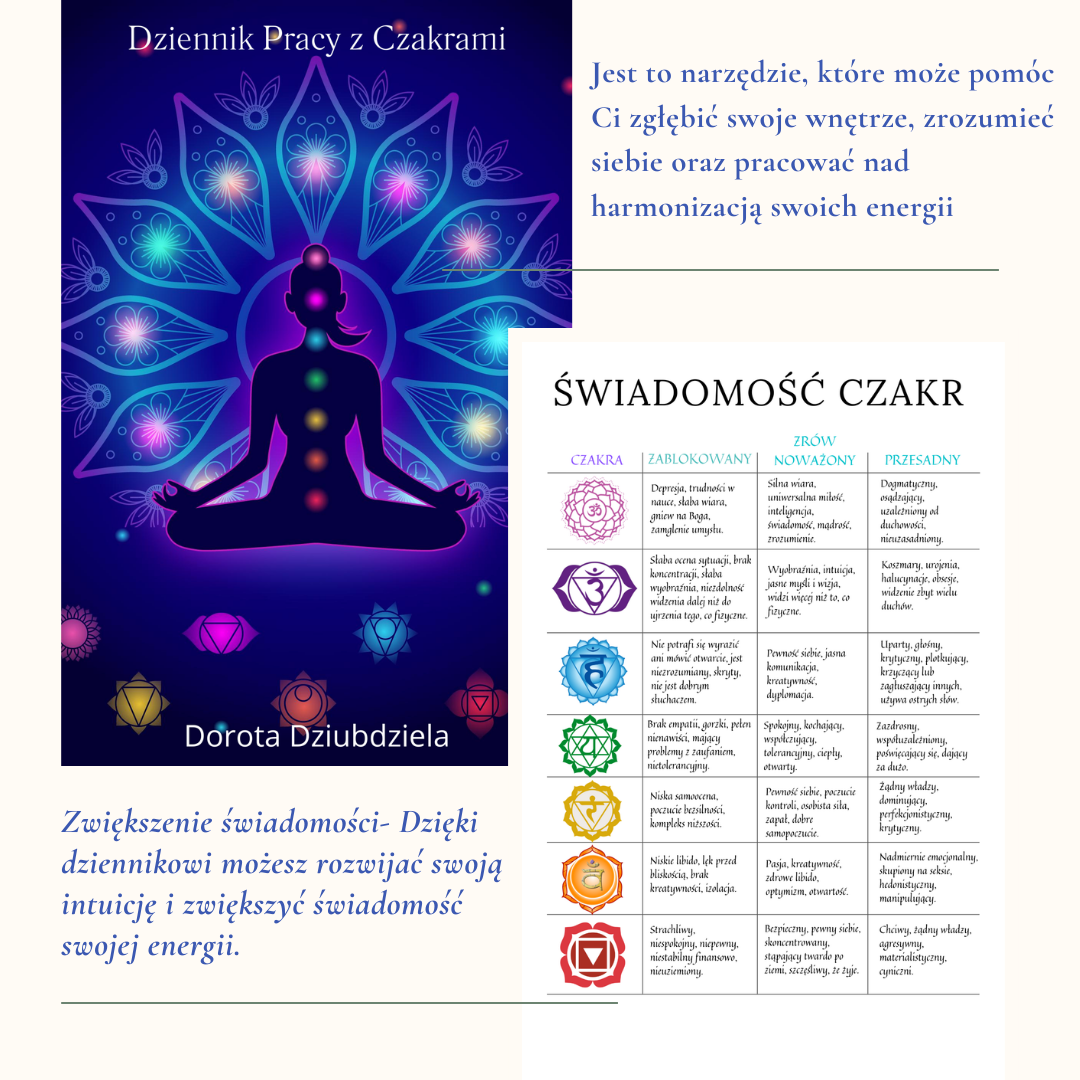 Dziennik Pracy z czakrami – Twój przewodnik po wewnętrznej podróży Dziennik z pracy z czakrami to wyjątkowa forma prowadzenia notatek, która łączy w sobie praktykę duchową z tradycją pisania pamiętnika. Jest to narzędzie, które może pomóc Ci zgłębić swoje wnętrze, zrozumieć siebie oraz pracować nad harmonizacją swoich energii. Na czym polega prowadzenie takiego dziennika? Świadoma obserwacja- Codzienne wpisy pozwalają Ci śledzić swoje myśli, emocje i doświadczenia, zwracając szczególną uwagę na to, jak czujesz się w danym momencie.