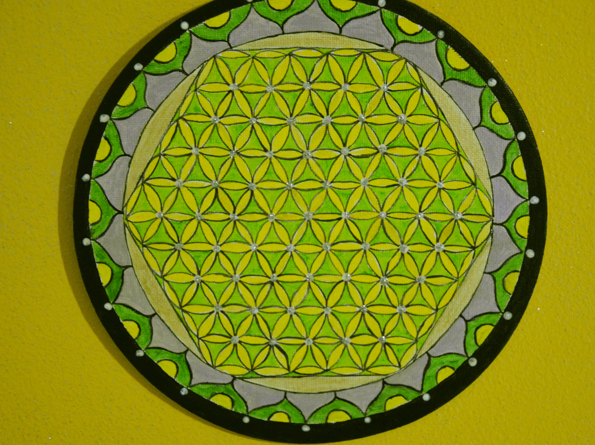 Centralnym motywem mandali jest precyzyjnie odwzorowany Kwiat Życia – geometryczna figura składająca się z nakładających się na siebie okręgów, tworzących misterny wzór przypominający kwiat. Uważa się, że ten święty symbol zawiera w sobie wszystkie prawa fizyki, matematyki i metafizyki, będąc matrycą wszelkiego istnienia. Kontemplacja tego wzoru może prowadzić do głębszego wglądu w siebie i otaczający nas świat, budząc poczucie jedności i przepływu.