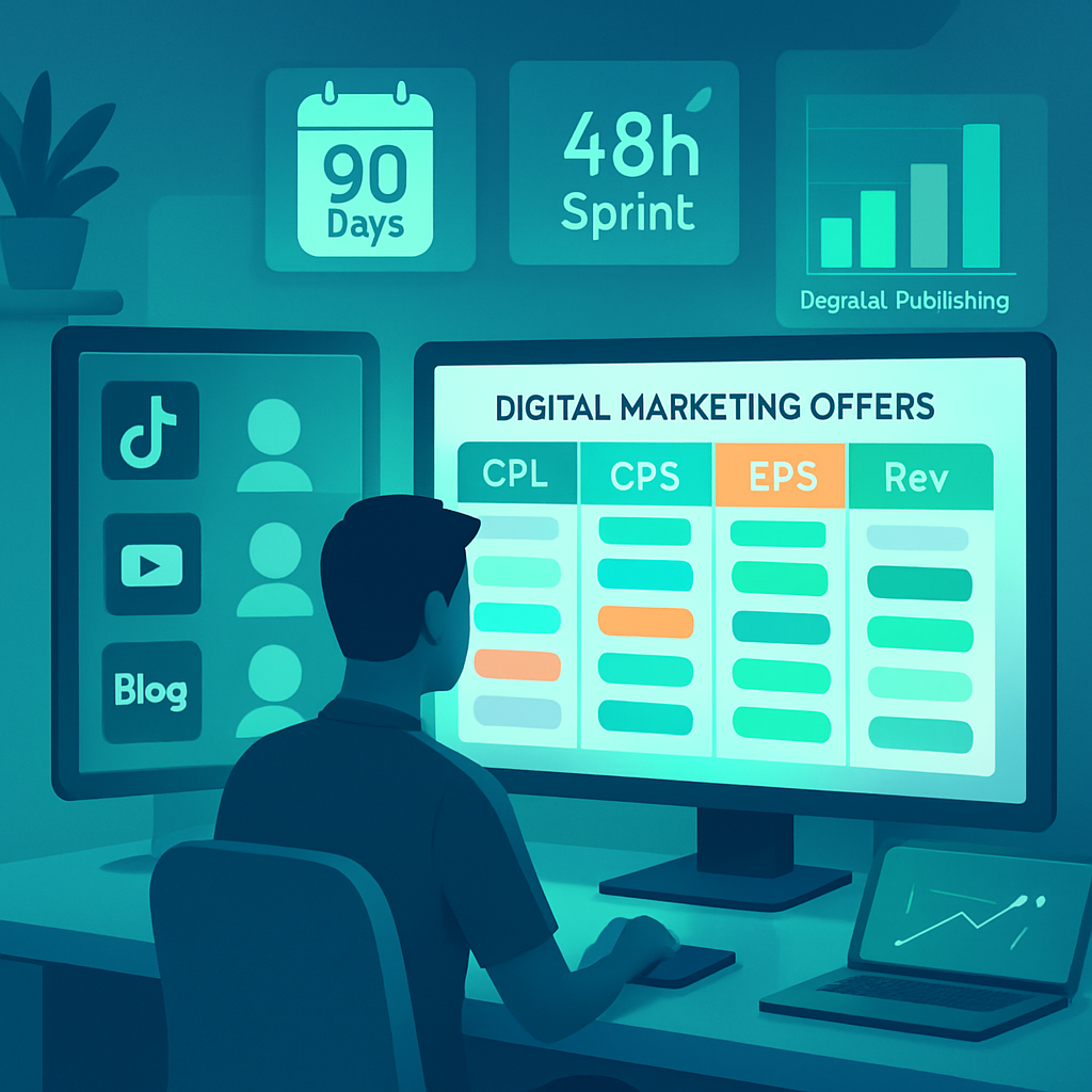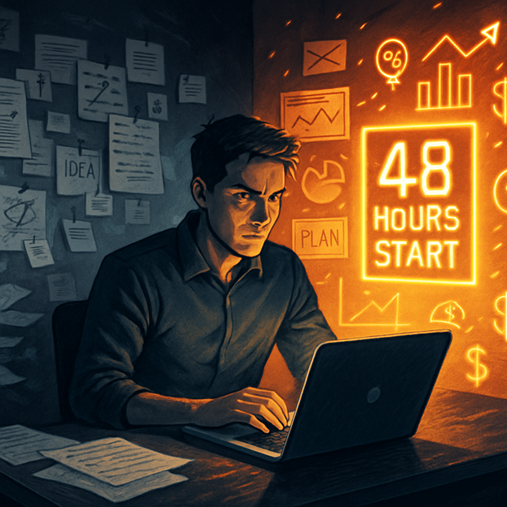 Jedna decyzja uruchamia Twój 48-godzinny start: pierwsza nisza, pierwsza oferta, pierwsza publikacja.