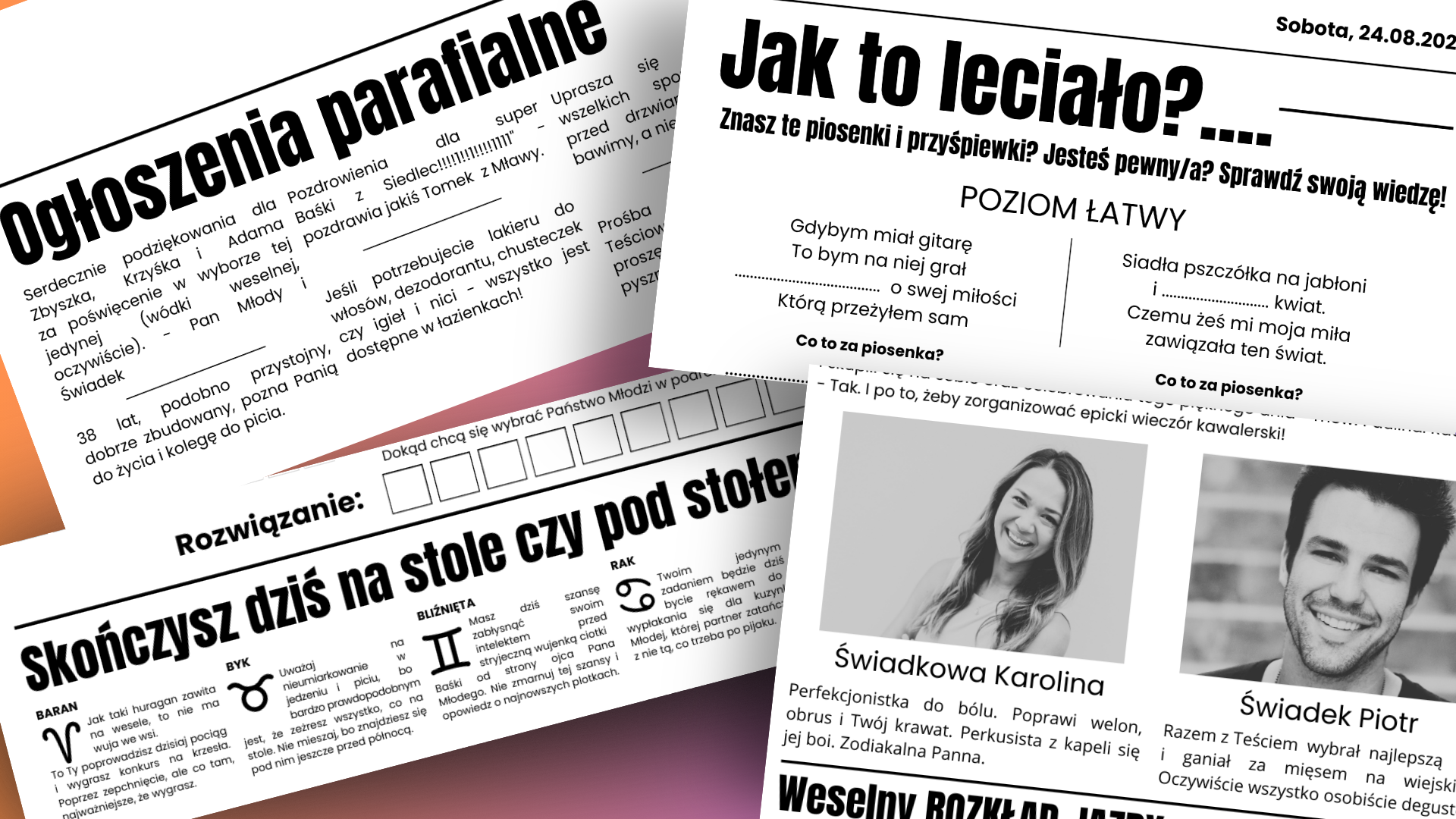 Wypróbuj także inne ślubne szablony: zawieszki na alkohol + 50 zabawnych tekstów, zaproszenie w formie kartki z kalendarza, śpiewnik weselny, ksiązeczka aktywności dla dzieci z zagadkami i kolorowankami.