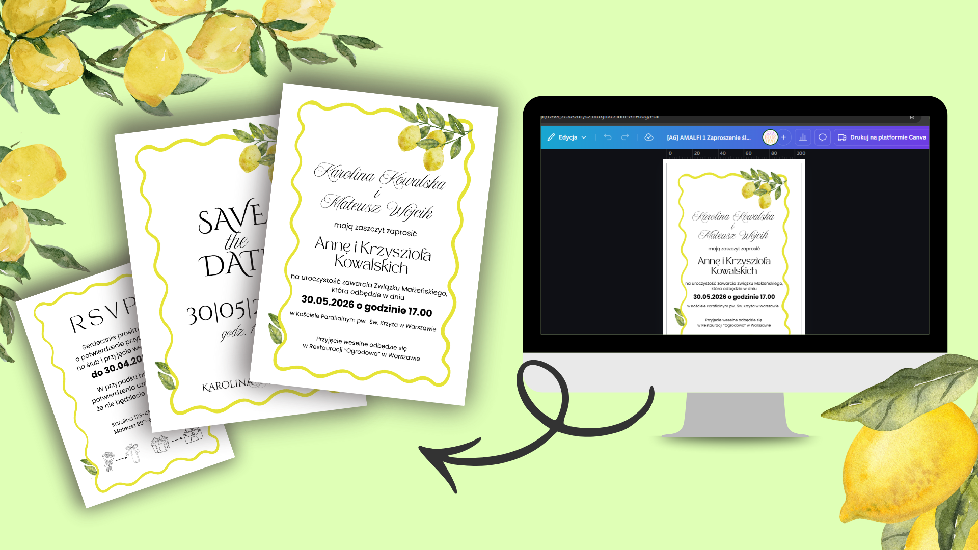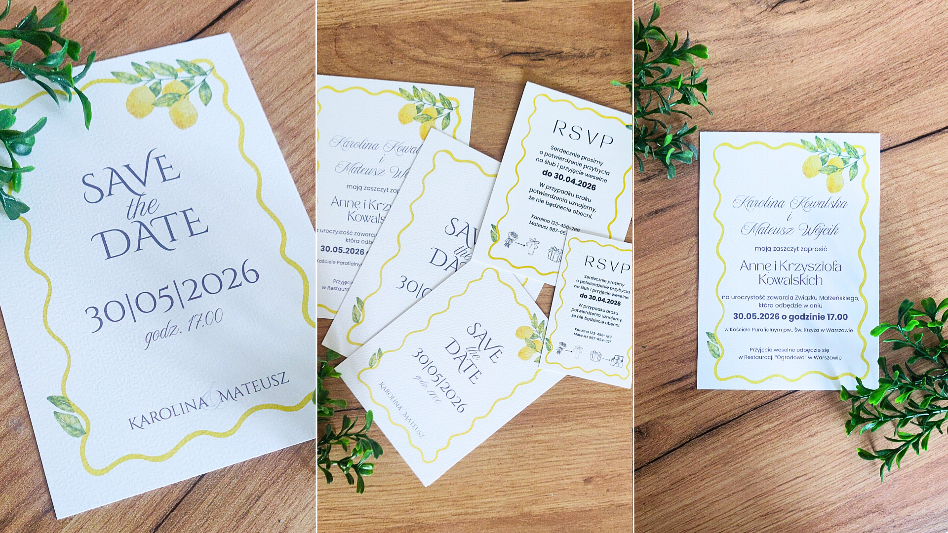 🍋 Cytrynowe zaproszenia ślubne, save the date i RSVP, jasny, radosny styl, idealne na wesele odbywające się wiosną i latem.