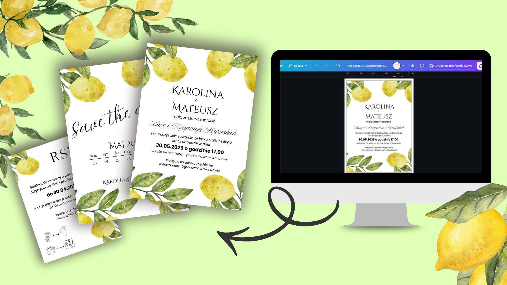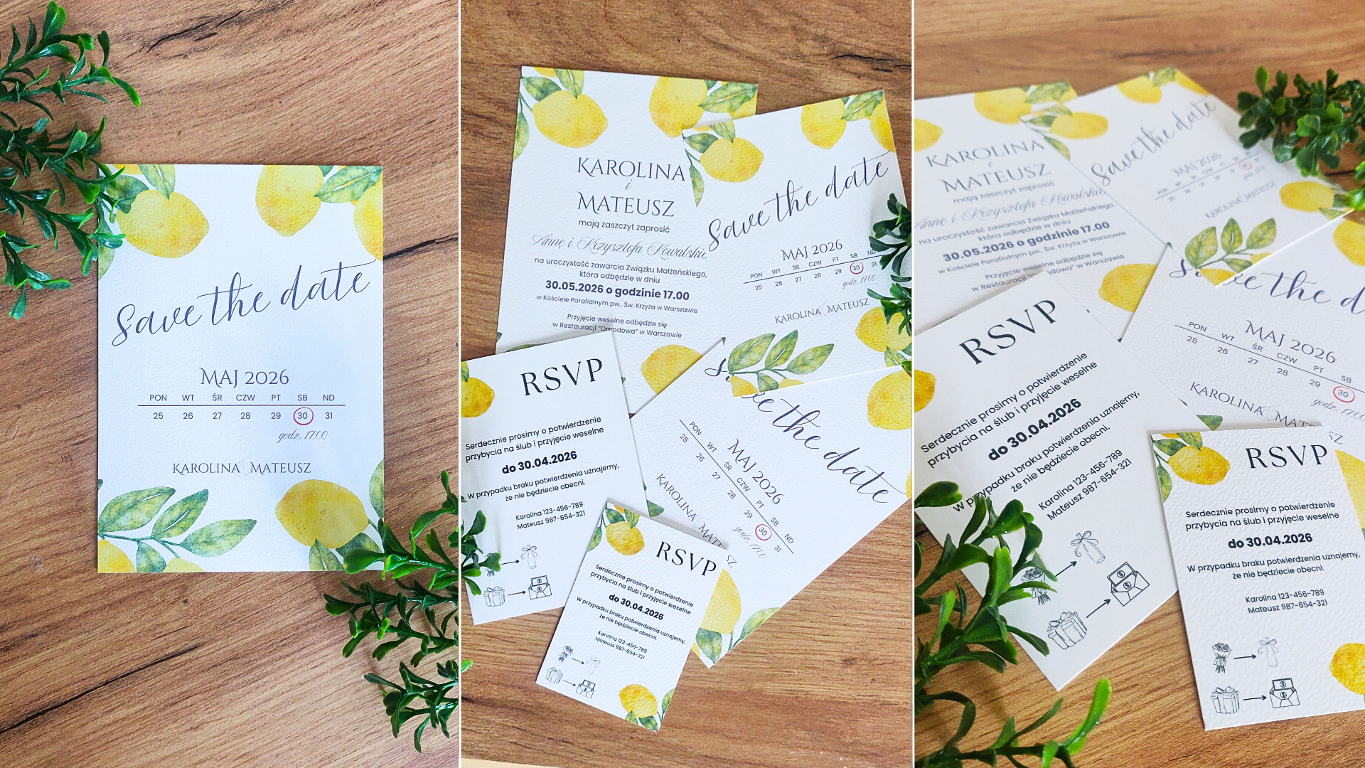 🍋 Cytrynowe zaproszenia ślubne, save the date i RSVP, jasny, radosny styl, idealne na wesele odbywające się wiosną i latem.