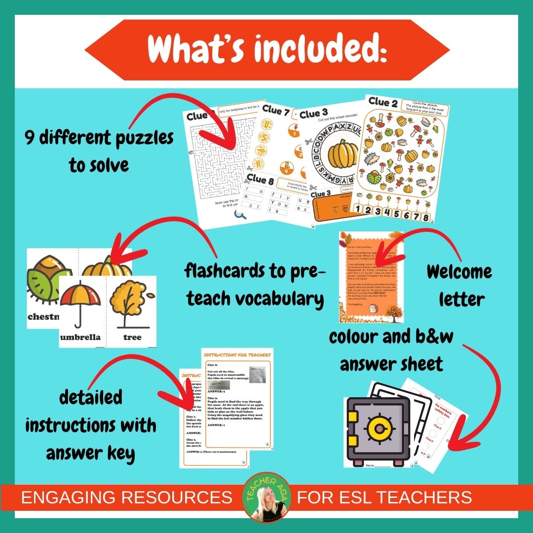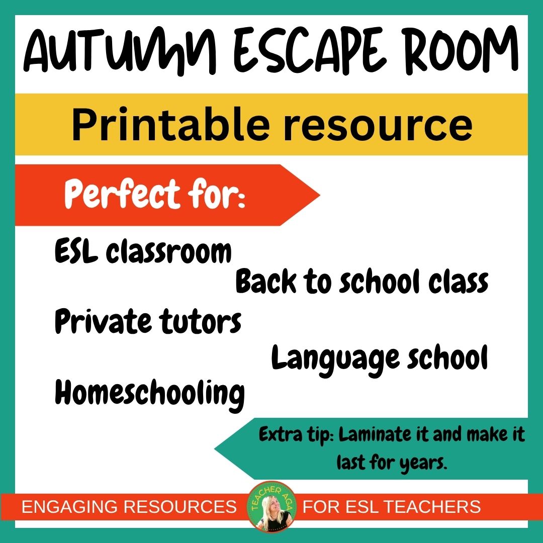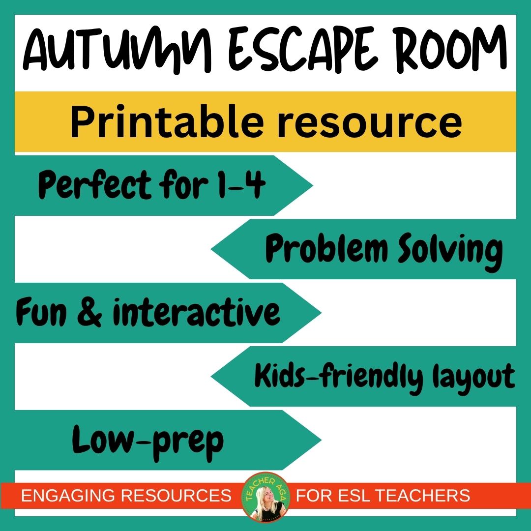 The Autumn/Fall Escape Room is based on workstations with simple tasks, making it ideal for a one-hour ESL class for young learners. A variety of challenges, using problem-solving, critical thinking, and English language skills to break free.