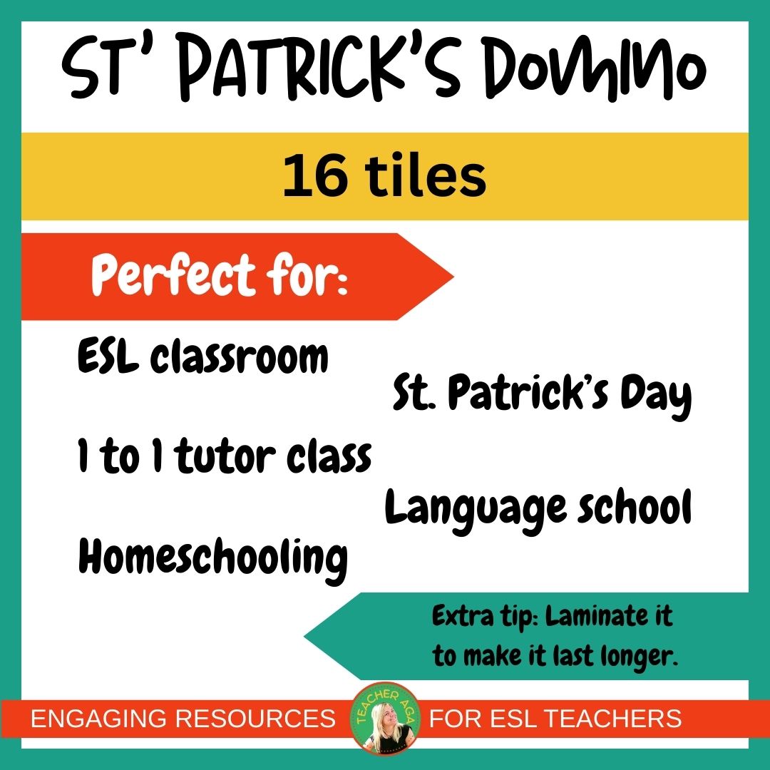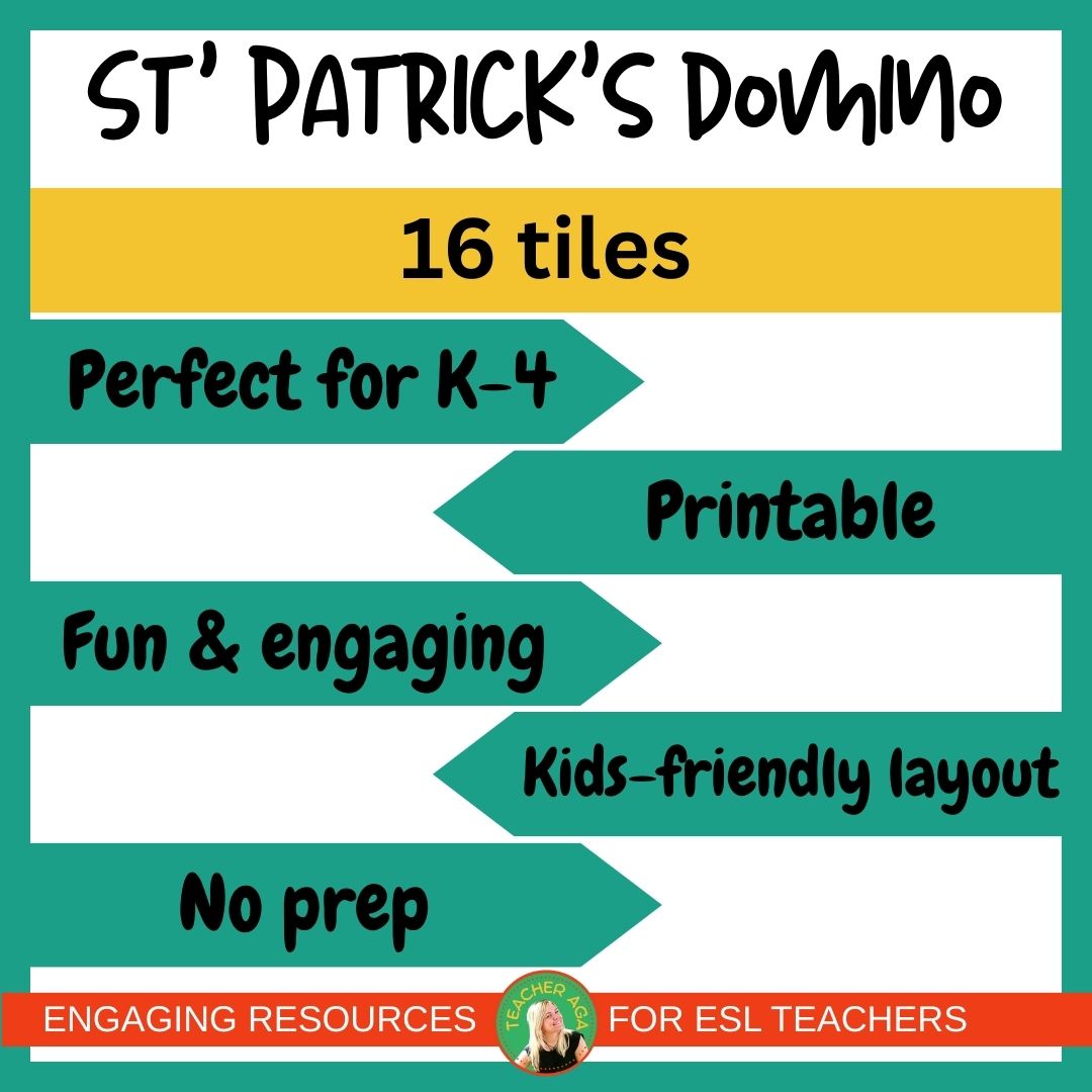 Użyj tego domina, aby zaangażować swoich uczniów w zabawną aktywność, która zachęca do czytania i dopasowywania. Ta gra to świetny sposób na naukę słownictwa związanego z Dniem Świętego Patryka.