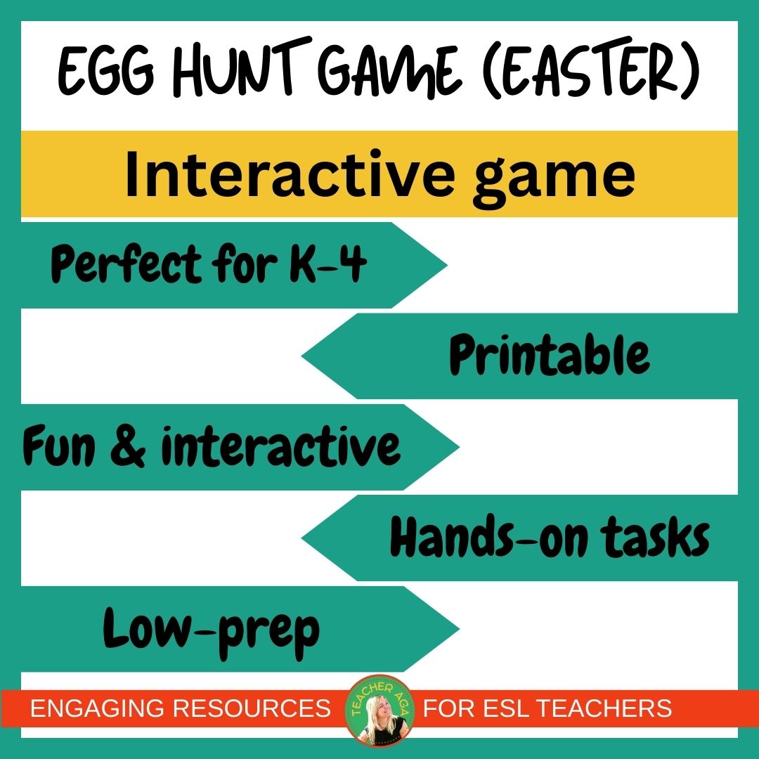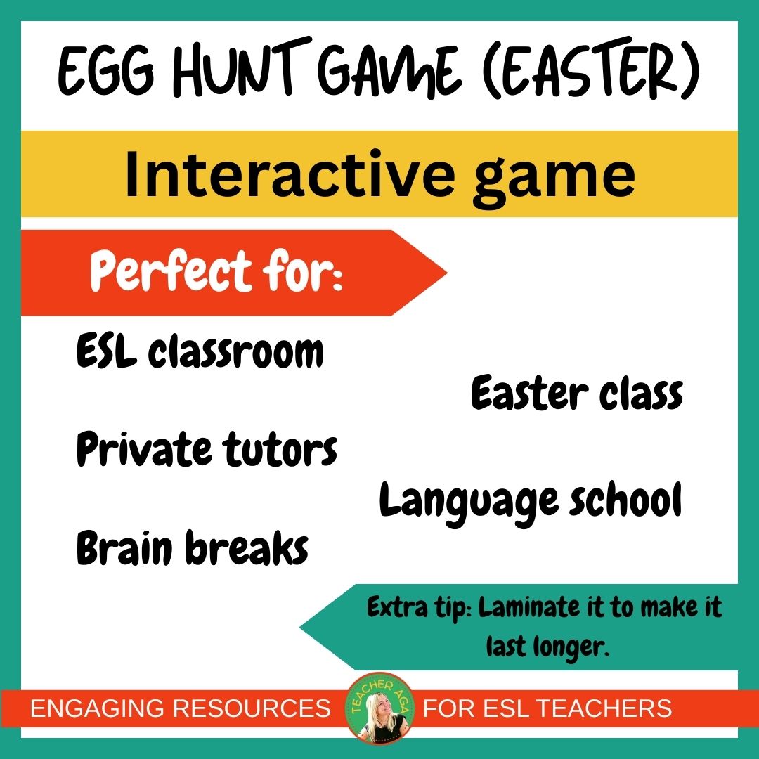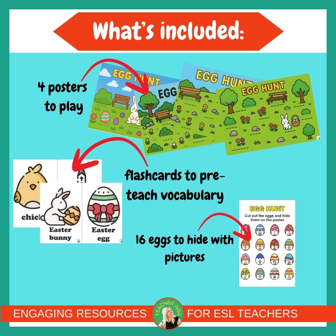 Spraw, aby Twoje zajęcia z języka były jeszcze bardziej radosne tej Wielkanocy dzięki tej angażującej zabawie Easter Egg Hunt! Ten gotowy do użycia zestaw PDF jest idealny dla młodszych uczniów – szczególnie przedszkolaków i uczniów klas 1-3, do ćwiczenia słownictwa angielskiego w wiosennej atmosferze. Świetnie sprawdzi się także podczas wielkanocnych zabaw i klasowych uroczystości.