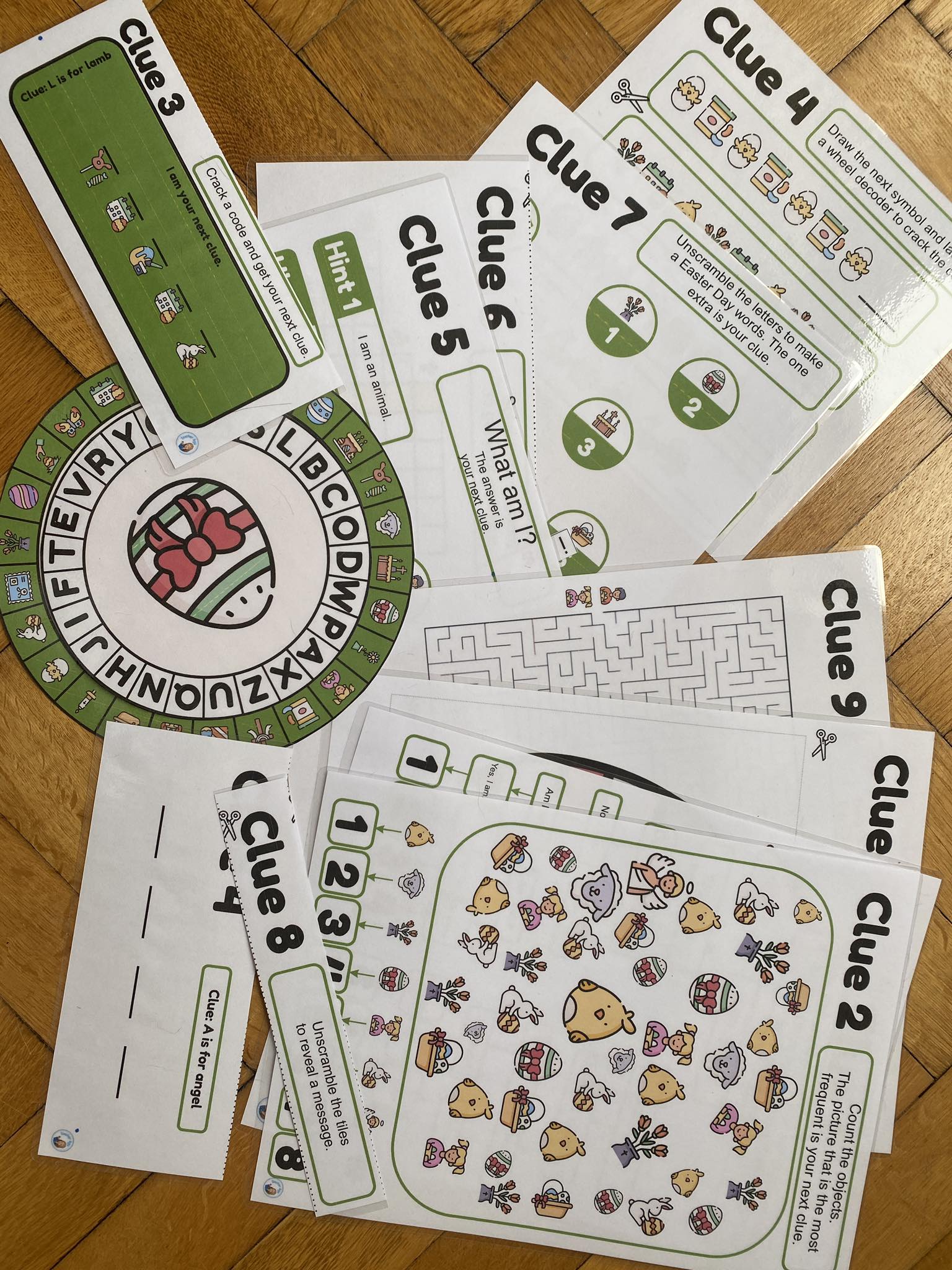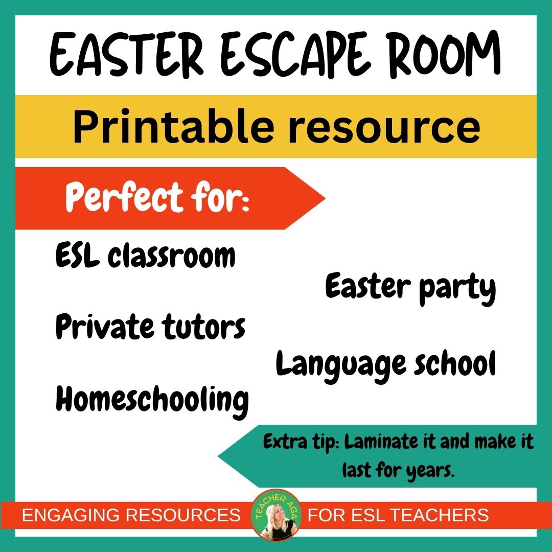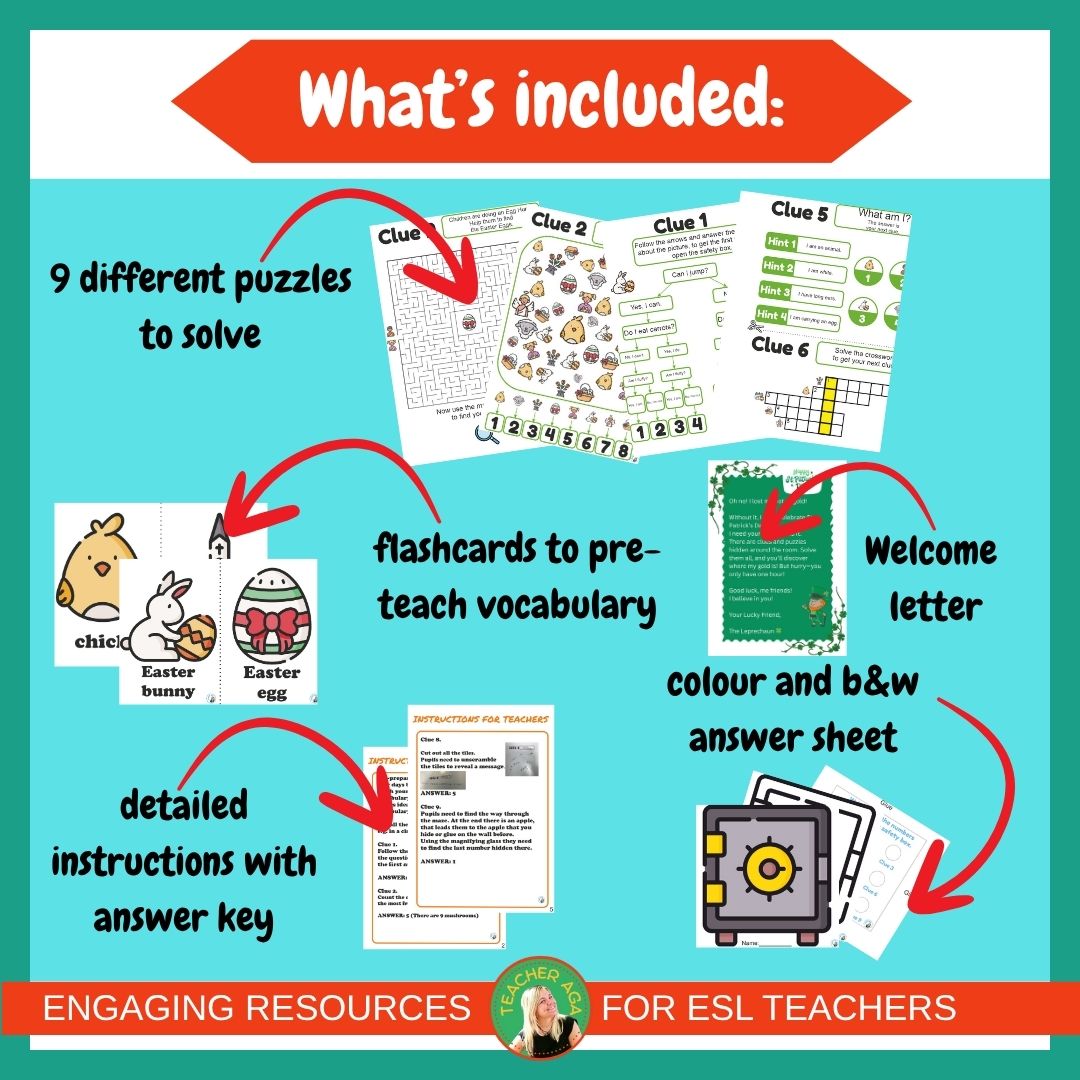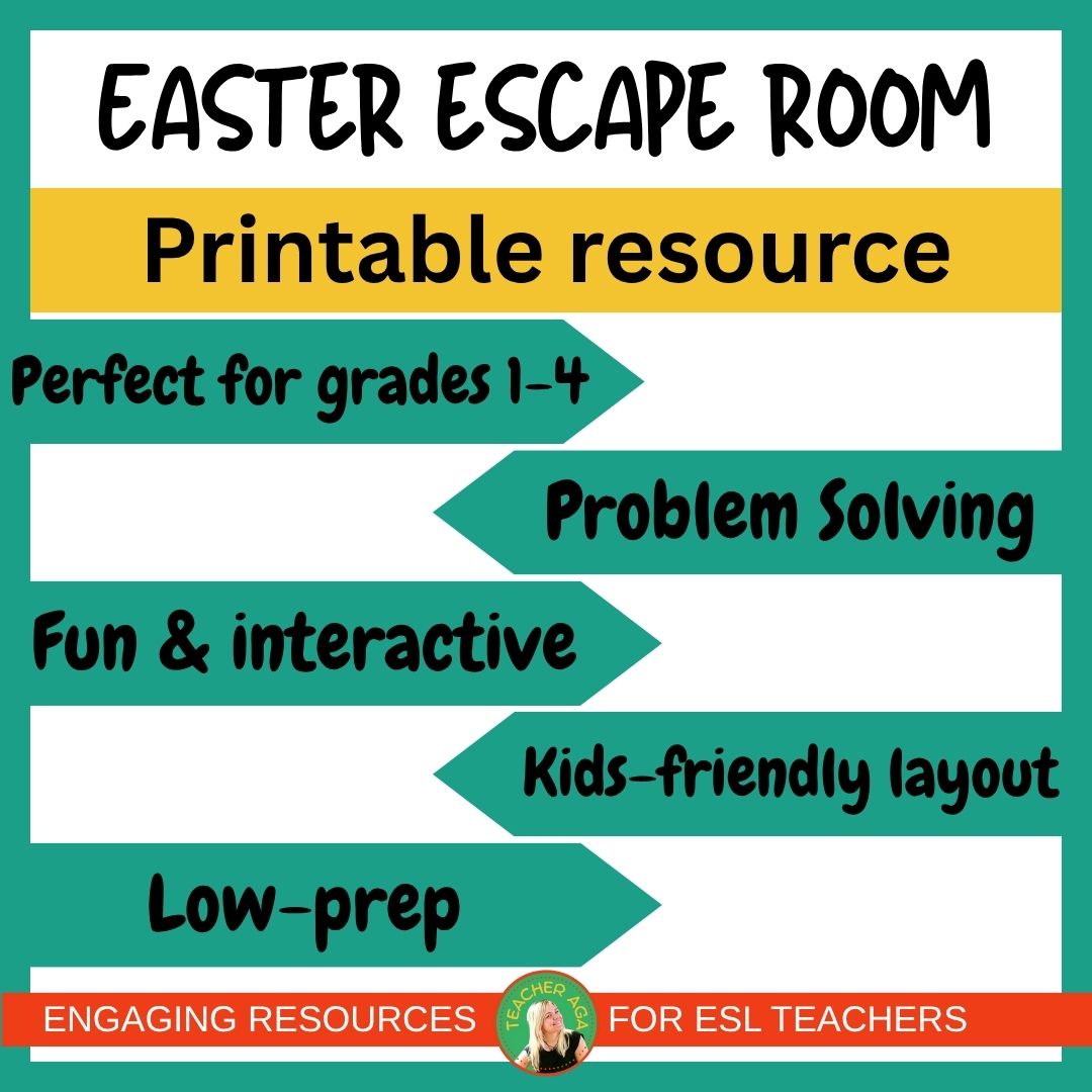 Easter Escape Room oparty jest na pracy w stacjach z prostymi zadaniami, dzięki czemu idealnie sprawdzi się na godzinnej lekcji ESL dla młodszych uczniów. Różnorodne wyzwania angażują uczniów poprzez rozwiązywanie problemów, myślenie krytyczne oraz wykorzystanie języka angielskiego, aby „wydostać się” z pokoju.