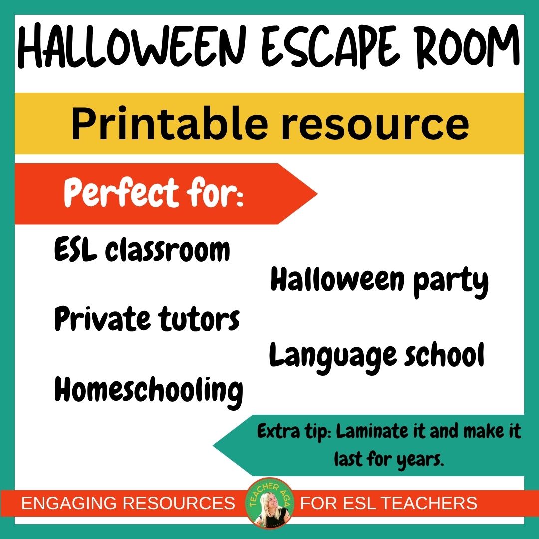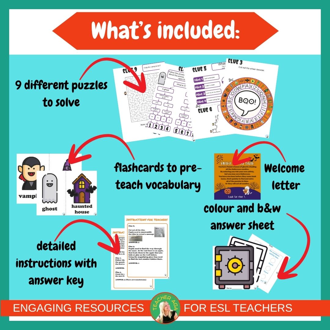 The Halloween Escape Room is based on workstations with simple tasks, making it ideal for a one-hour ESL class for young learners. A variety of challenges, using problem-solving, critical thinking, and English language skills to break free. Ready for the scare of a lifetime?