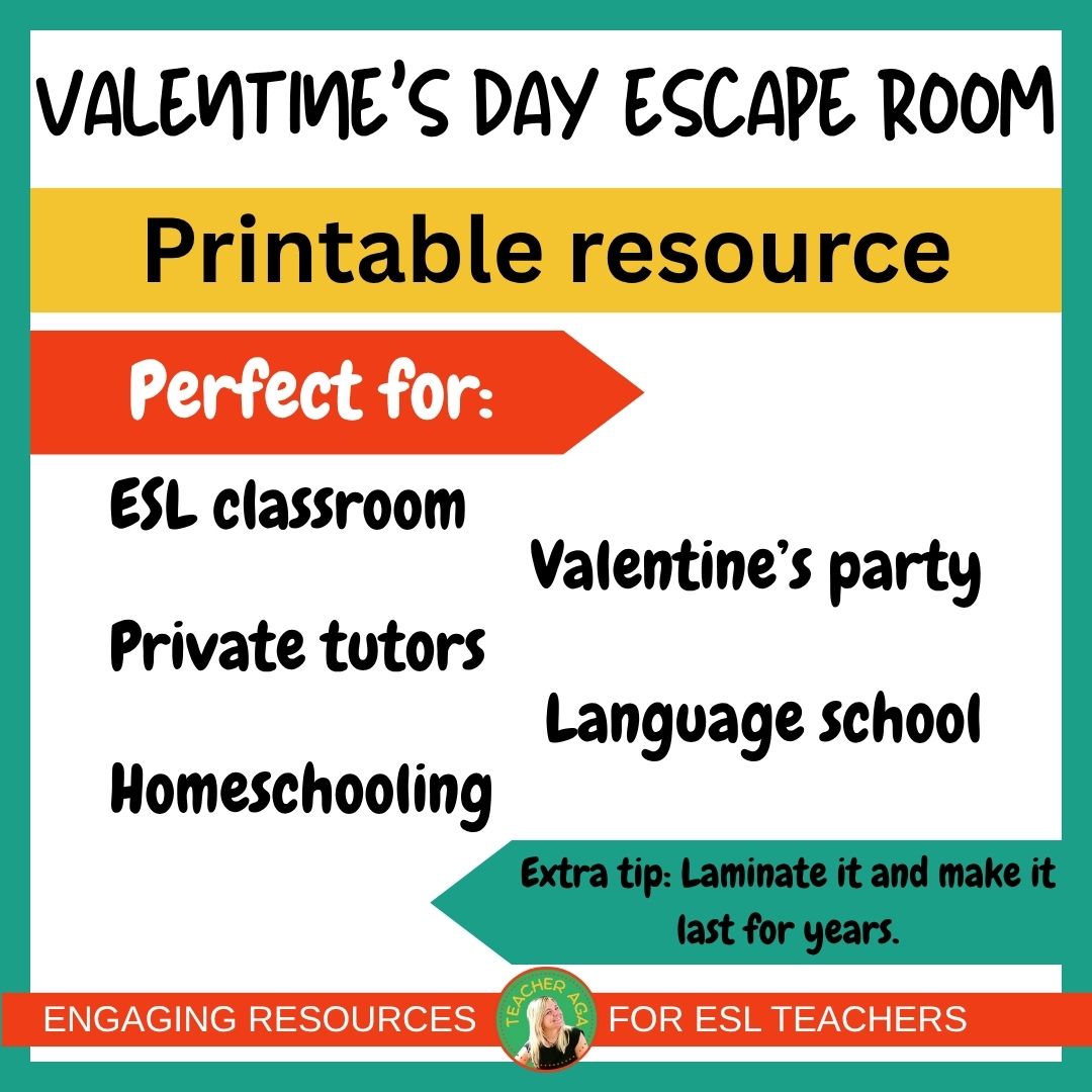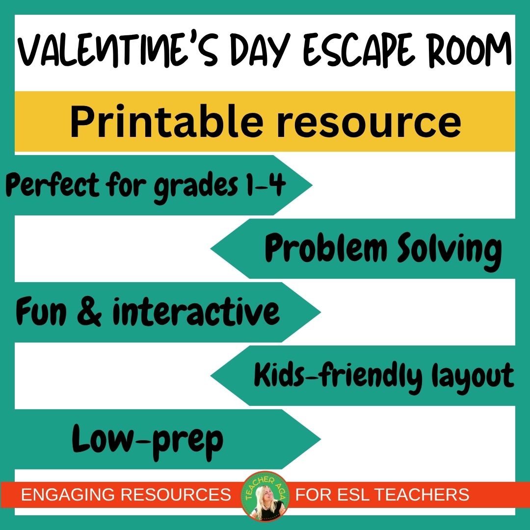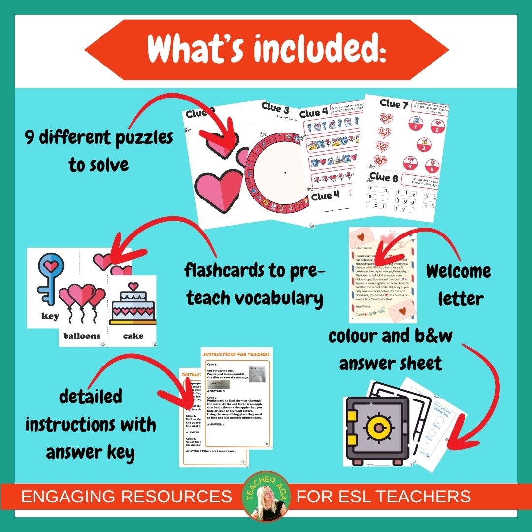 Valentynkowy Escape Room został oparty na pracy w stacjach z prostymi zadaniami, dzięki czemu świetnie sprawdzi się podczas jednogodzinnych zajęć ESL dla młodszych uczniów. Różnorodne wyzwania angażują myślenie logiczne, rozwiązywanie problemów, krytyczne myślenie oraz umiejętności językowe, pomagając uczniom „uciec” z pokoju.