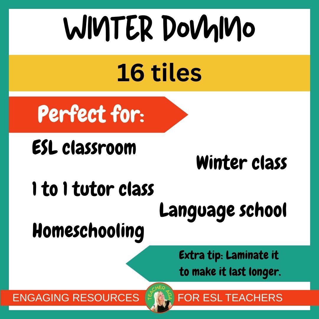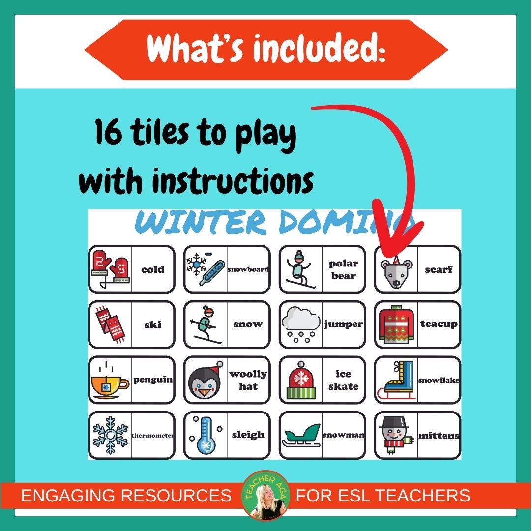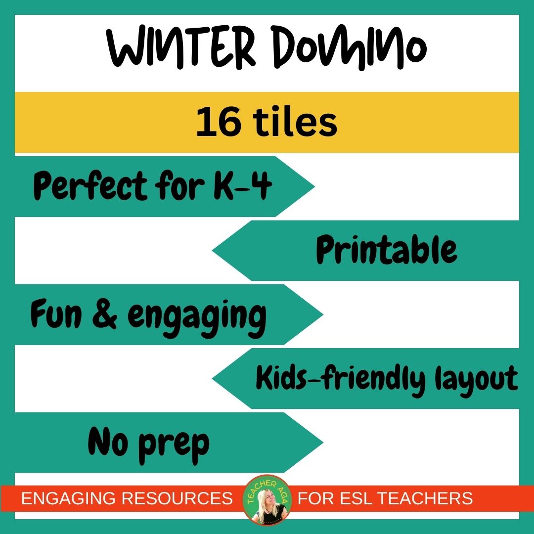 Zimowe domino sprawi, że Twoje zajęcia będą jeszcze przyjemniejsze. To świetny sposób na ćwiczenie zimowego słownictwa z uczniami, idealny na lekcje ESL oraz do szkoły podstawowej.