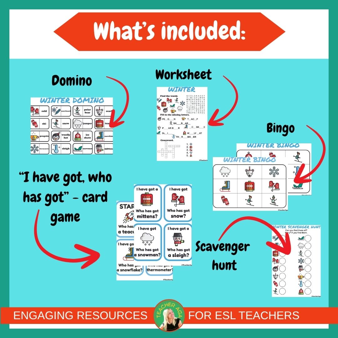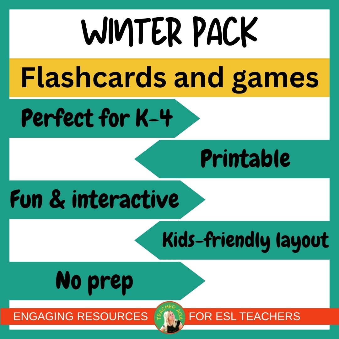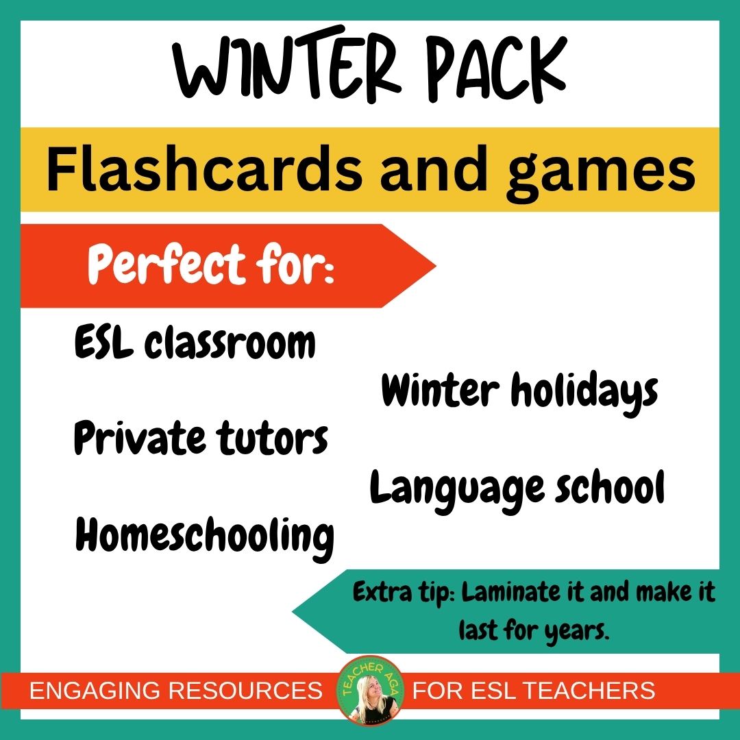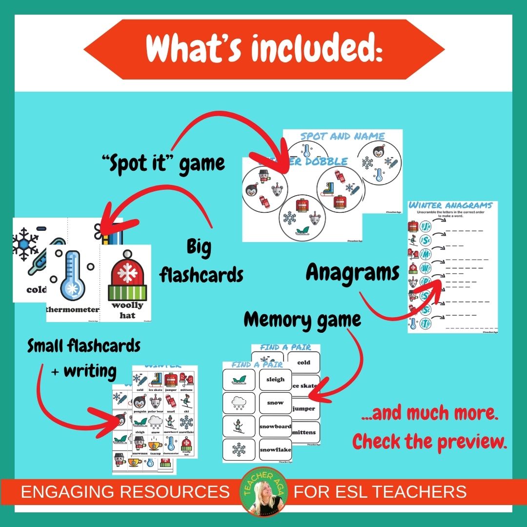 Ten zestaw jest pełen różnorodnych zimowych aktywności dla uczniów ESL (English as a Second Language). Przeznaczony dla dzieci w przedszkolu oraz szkole podstawowej. To idealny zestaw materiałów edukacyjnych (fiszki, gry, karty pracy) dla młodszych uczniów języka angielskiego.