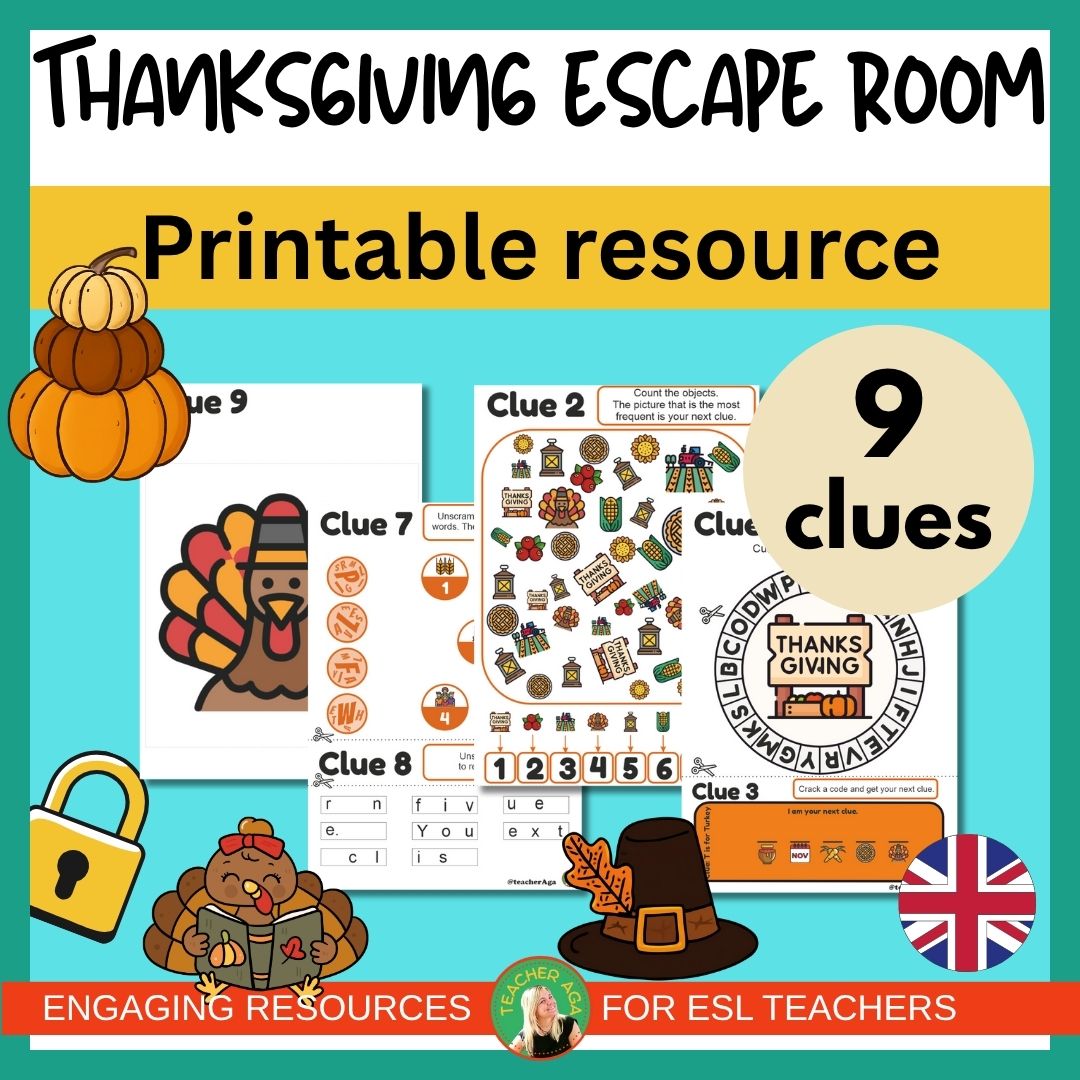 Jesienny Pakiet | Escape Room, słownictwo, gry | ESL; Jesienny Escape Room | EFL/ESL | Stacje PDF Breakout, jesienne słownictwo, gra | bez przygotowania | aktywności dla dzieci ESL, Escape Room na Thanksgiving | ELA ESL | Klasy 1–4 | do druku