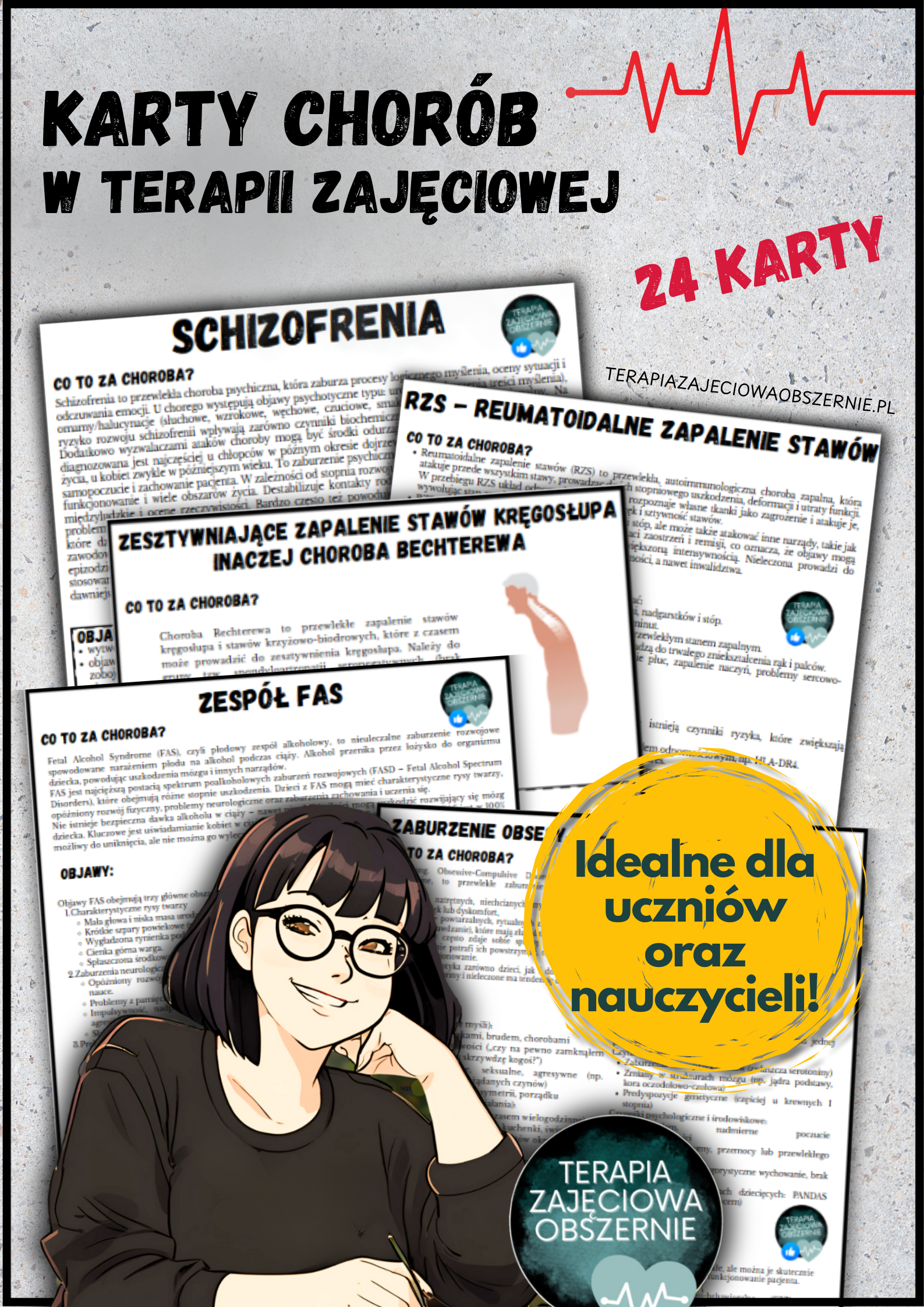 BestsellerKarty z opisami chorób/zaburzeń - 24 karty A4 Terapia zajęciowa obszerniePoznaj 24 Karty Chorób – przejrzyste, konkretne i przydatne materiały edukacyjne.24,99 zł