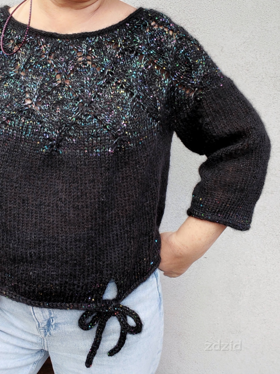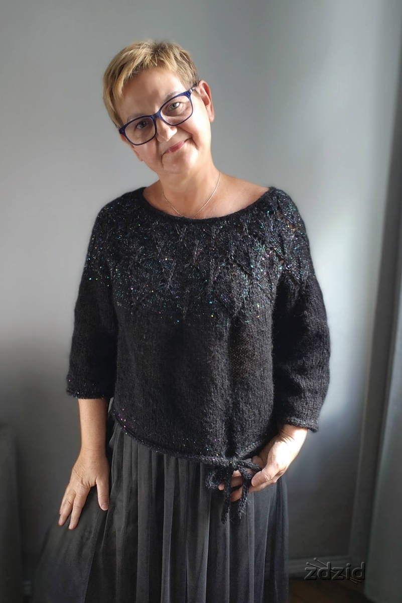 Bluzka przerabiana od góry, okrągły karczek z ażurem i cekinami. Rękawy o długości 3/4.