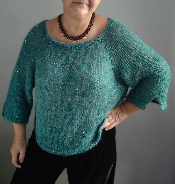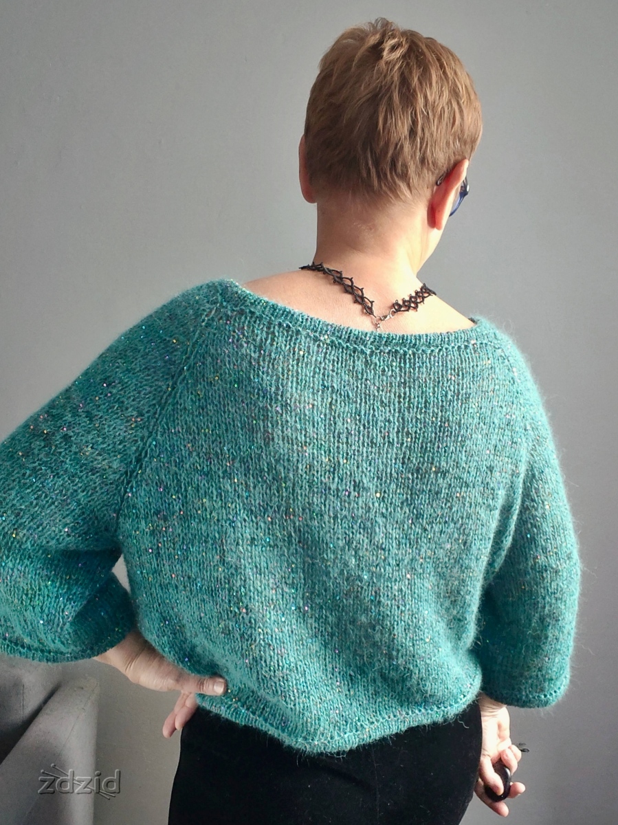 Bluzka przerabiana od góry, na okrągło. Reglanowe rękawy o długości 3/4, szeroki dekolt, dodana nitka z cekinami.