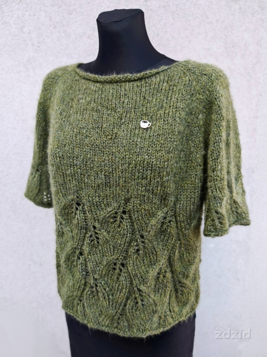 Bluzka z krótkim rękawem ozdobiona wzorem ażurowych liści na dole i na rękawach. Dekolt typu "łódka", reglan przerabiany od góry, na okrągło. Stopień trudności określam jako łatwy :-)