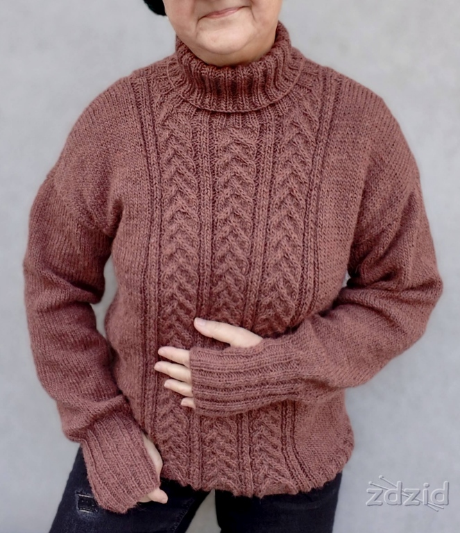 Sweter dziergany w częściach, od dołu i zszywany. Rękawy z przedłużonym ściągaczem z dziurą na kciuk – przerabiane na okrągło. Przód i tył ozdobiony motywem 3 „zaplecionych” warkoczy.