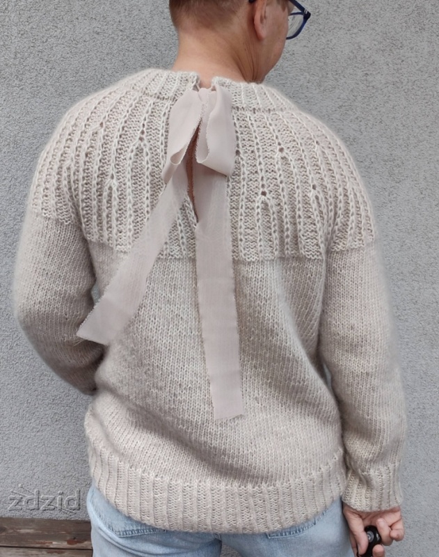 Sweter z okrągłym karczkiem, przerabiany od góry, na okrągło. Na plecach „pęknięcie” z wiązaniem.