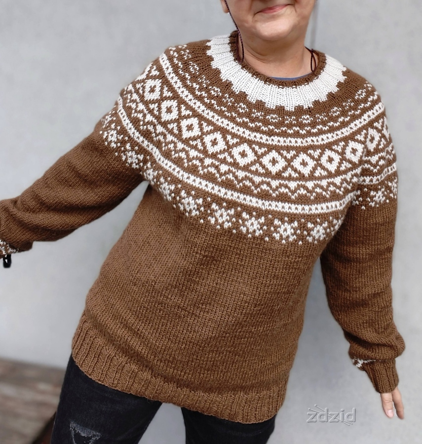 Sweter przerabiany jest od góry do dołu, w całości, na okrągło. Wzór unisex ale rozmiary podane są męskie.