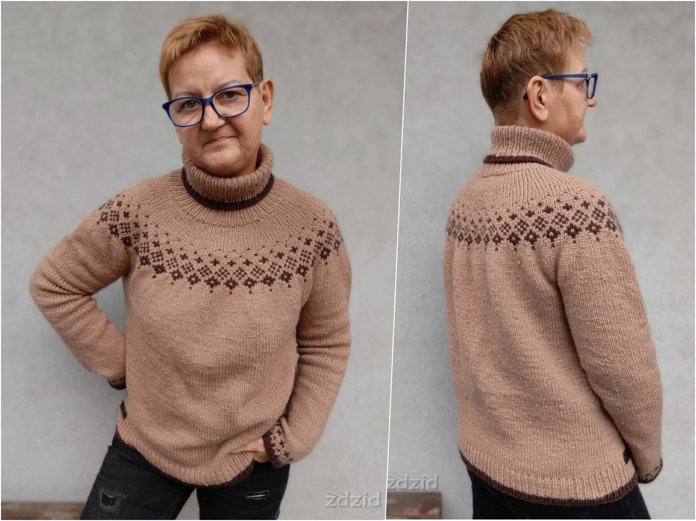 Sweter dziergany od góry, w całości na okrągło. Okrągły karczek ozdobiony żakardowym wzorem. Dekolt pogłębiony rzędami skróconymi. W komplecie drugi wariant wzoru - z golfem i mniejszym/łatwiejszym żakardem.