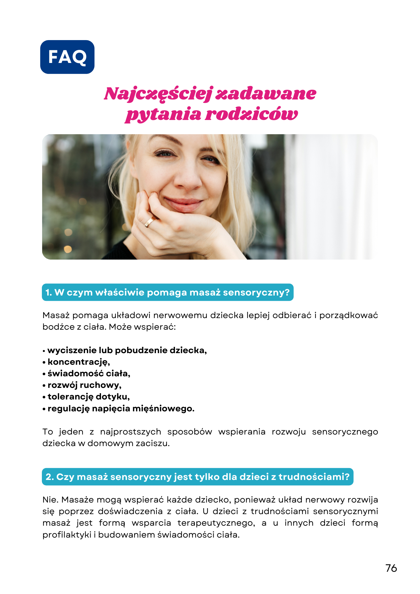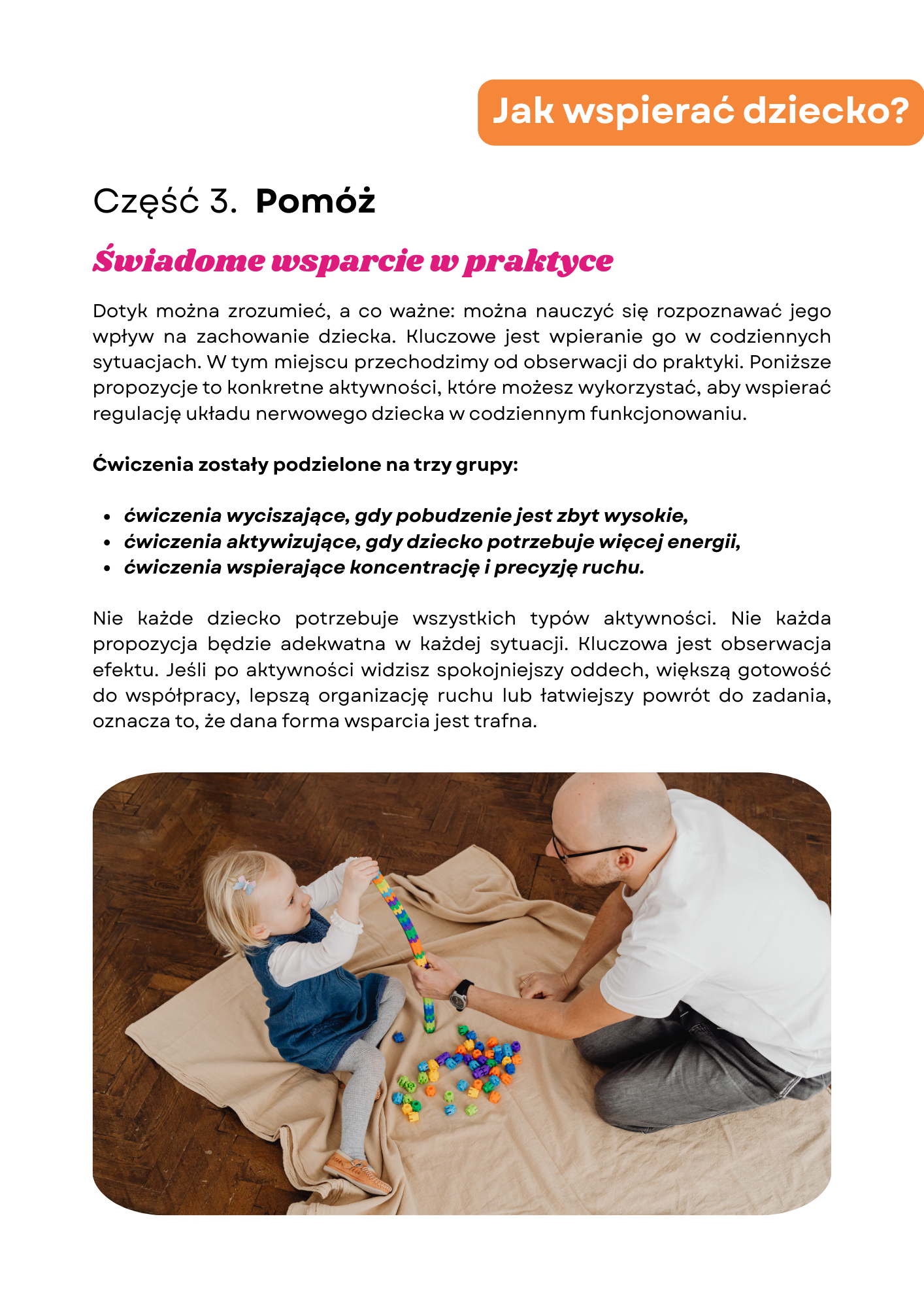 Pokazujących krok po kroku, jak wykonywać ćwiczenia i masaż sensoryczny wspierający regulację dziecka.