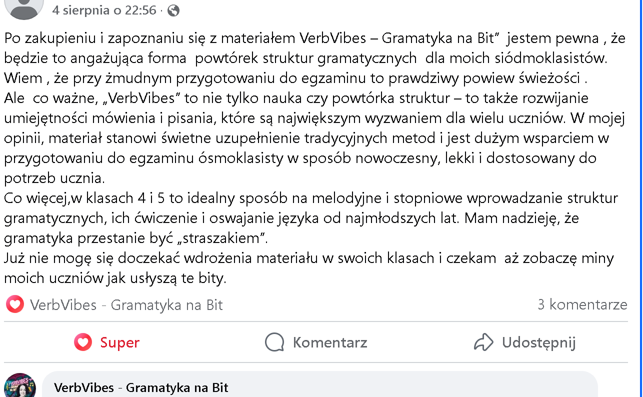 Co mówią o VerbVibes nauczyciele, którzy już zakupili materiały? Opinie przeczytasz Fanpage VerbVibes na Fb. Zobacz jedną z nich.