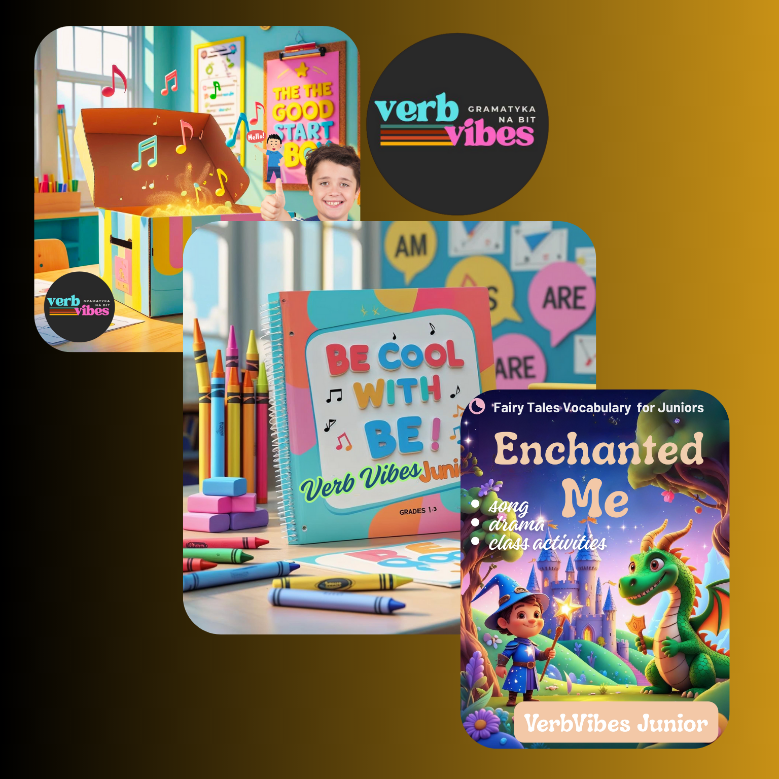Druga ścieżka songbooków to VerbVibes Junior – dla klas 1-3, który już wystartował z Songbookami "Be Smart with BE” oraz "Enchanted Me". VerbVibes Junior to muzyczne pakiety edukacyjne dla dzieci, które łączą naukę angielskiego z rytmem i zabawą. Każdy zestaw zawiera piosenkę, gry, karty pracy, multisensoryczne aktywności i gotowy scenariusz lekcji. W zależności od pakietu czekają na dzieci tematyczne przygody, takie jak teatrzyk, balik czy projekty kreatywne. Dzięki muzyce i ruchowi dzieci szybciej zapamiętują słownictwo i gramatykę, a lekcje stają się pełne energii i radości. 🎶✨